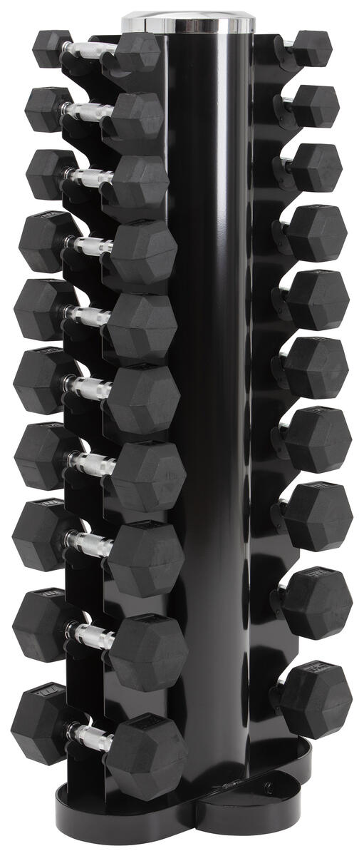 Ett praktiskt hantelställ som rymmer hantlar med vikter 1-10 kg samt 12,5+15+17,5+20 kg. Fyra låsbara hjul följer med vilket gör det enkelt att flytta på hela hantelpaketet. Mått: 51x58x120 cm.