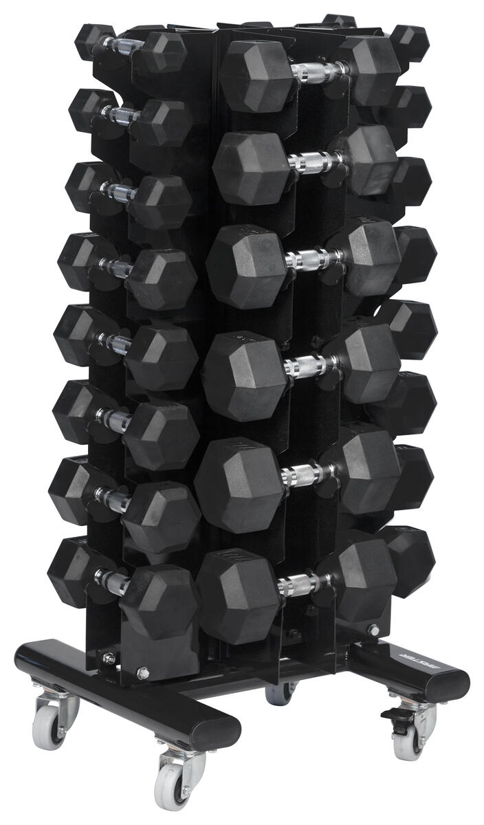 Ett praktiskt hantelställ som rymmer hantlar med vikter 1-10 kg samt 12,5+15+17,5+20 kg. Fyra låsbara hjul följer med vilket gör det enkelt att flytta på hela hantelpaketet. Mått: 51x58x120 cm.