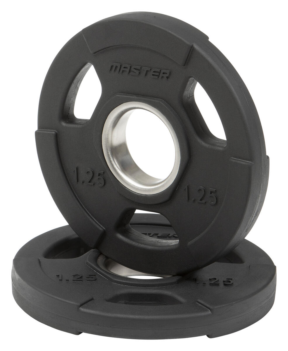 1 st/fp. Gummiklädd vikt med internationella mått, håldiameter 50,5 mm. Rostfri centrumring och handtagsgrepp. Vikt: 1,25 kg. Diameter: 170 mm. Tjocklek: 29 mm.