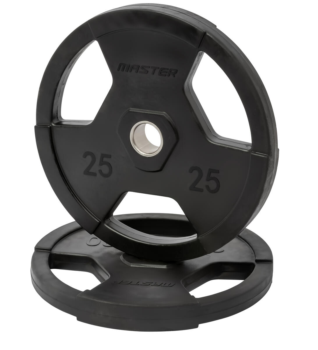 1 st/fp. Gummiklädd vikt med internationella mått, håldiameter 50,5 mm. Rostfri centrumring och handtagsgrepp. Vikt: 25 kg. Diameter: 418 mm. Tjocklek: 65 mm.
