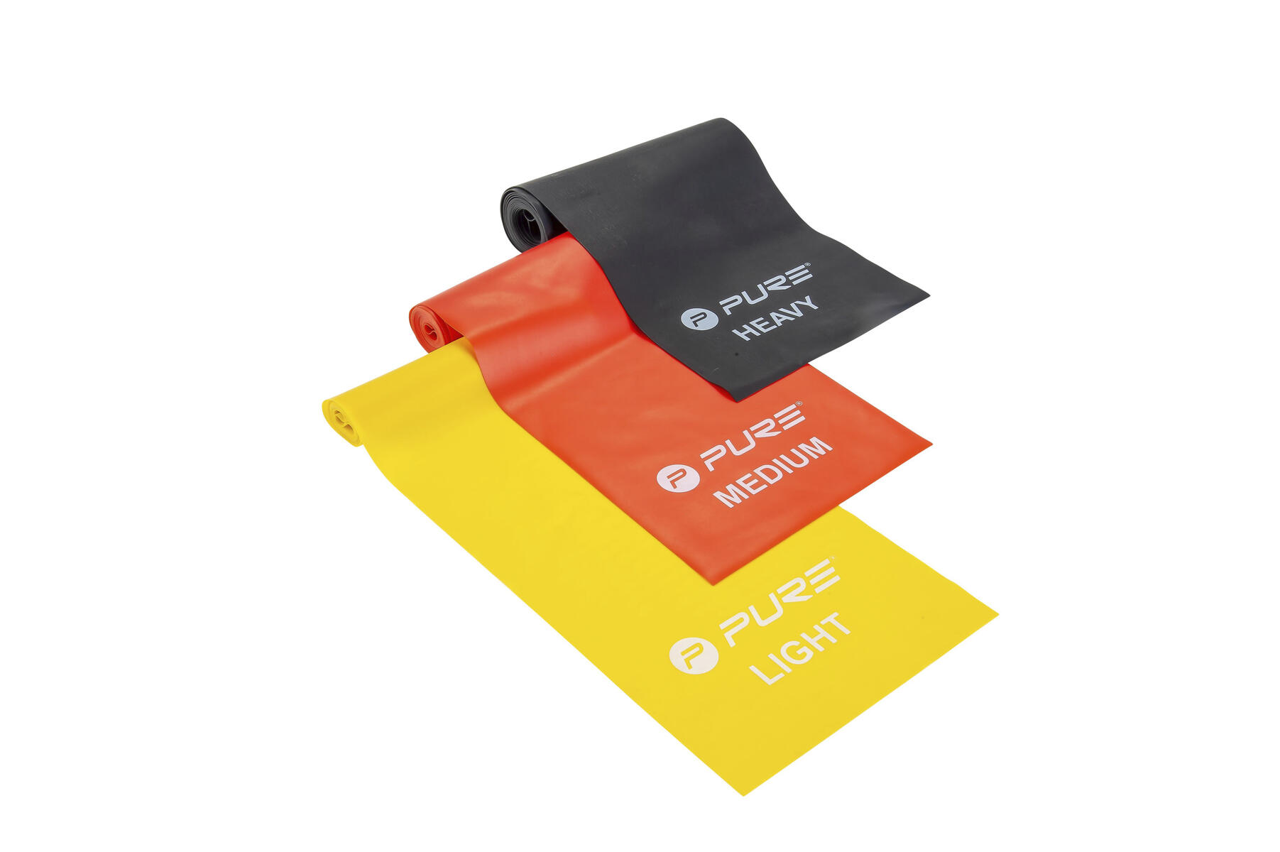 3 st/fp. Ett elastiskt träningsgummiband som är ett effektivt och enkelt träningsredskap. Bandet kan användas till många övningar, vid uppvärmning och stretchning. Setet innehåller motstånden lätt, medium och hårt. Av latex.