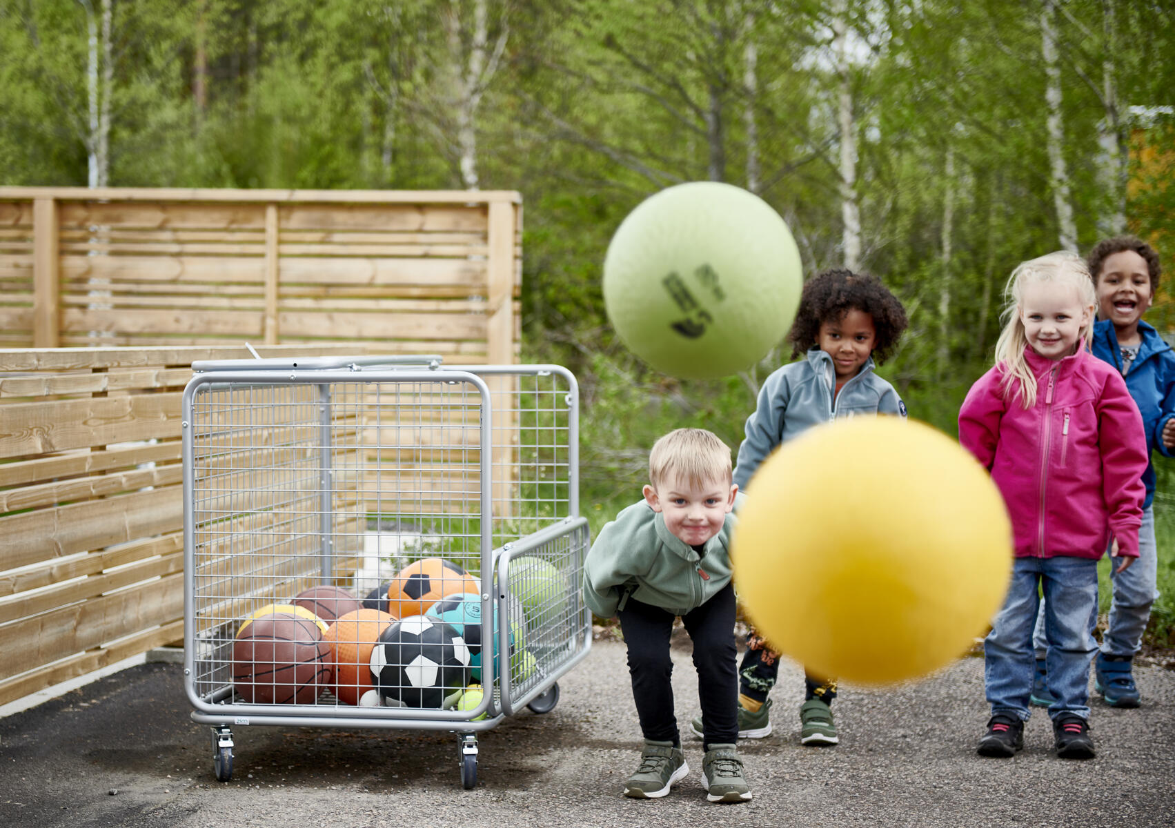 Förvaringsvagn 71907 inklusive rastpaket för en aktiv rast. Aktivitetsvagnen innehåller: 2 fotbollar av gummi stl 4, 6 tennisbollar, 6 studsbollar av gummi ø 6 cm, 1 frisbee, 3 hopprep av TPE, 2 långrep av TPE, 10 Squeeze mjuka bollar ø 10 cm, 1 basketboll stl 5, 2 twist, 2 par trampkrukor och en stor mjuk tärning. Från 3 år. Levereras omonterad.
