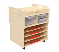 Mindre materialvagn på hjul med fack och lådor för flexibel förvaring. 4 låsbara hjul och handtag på kortsidorna. Plastlådor medföljer. Mått: 58,5x50x77 cm. Levereras omonterad. Monteringsanvisning medföljer. Tillverkad av lackad björk. FSC-märkt. PVC-fri.