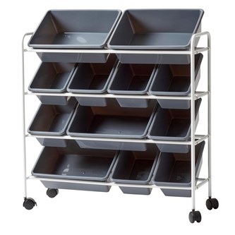 En behändig och flexibel förvaringslösning som passar i de flesta utrymmen eftersom den inte är så djup. Vagnen fungerar både ute och inne, bör förvaras inomhus nattetid. Det ingår 12 flyttbara plastbackar i 2 olika storlekar. Mått på vagn 87x32x97 cm. Mått på lådor: 4 st 41x30x13 cm och 8 st 20x30x13 cm. Av pulverlackerat stål, lådor av PP. Maxvikt 20 kg. Levereras omonterad och utan aktivitetspaket.