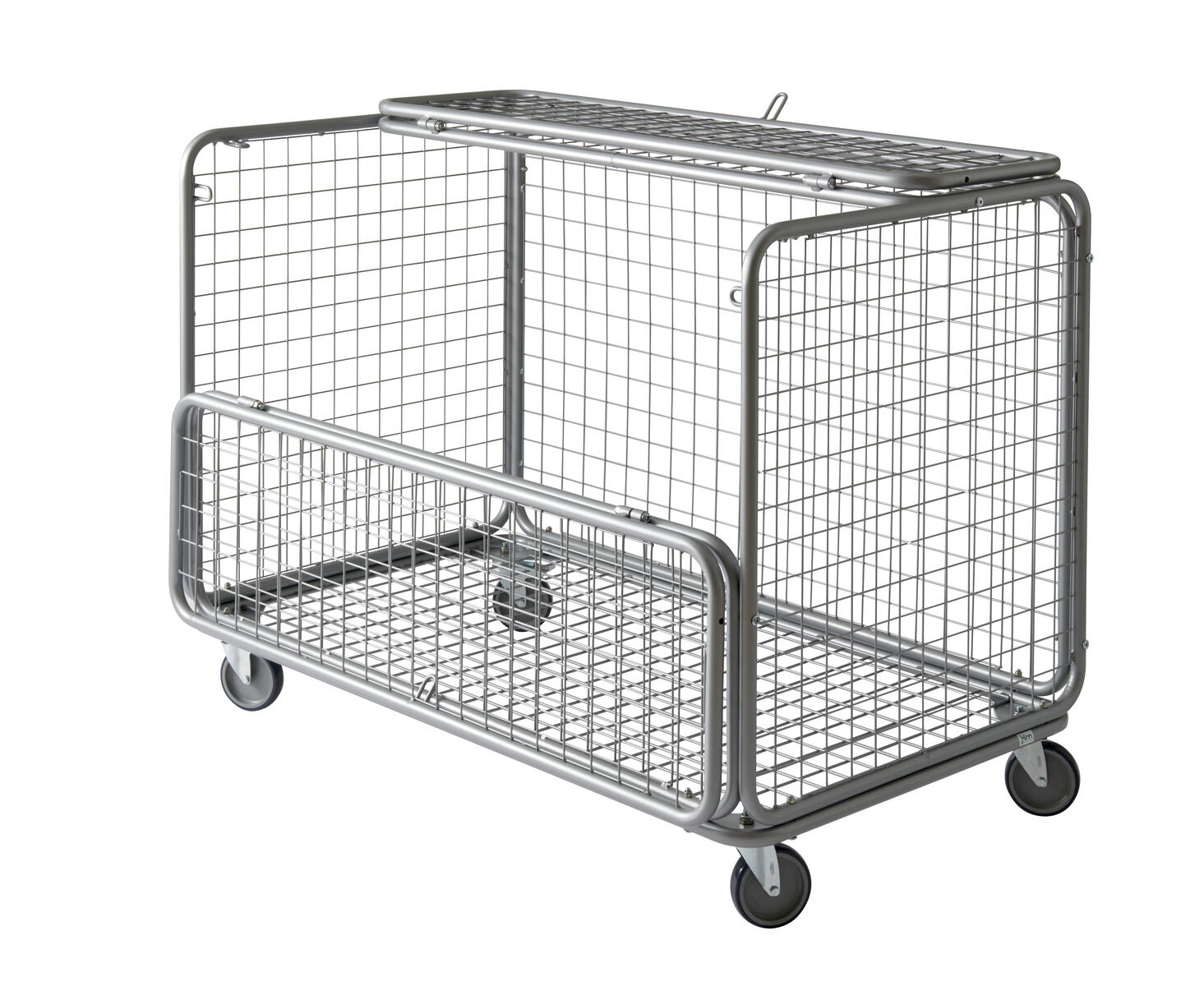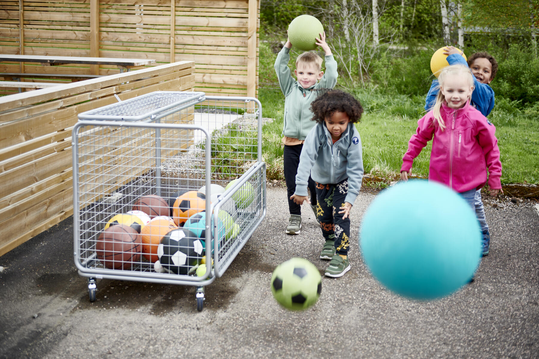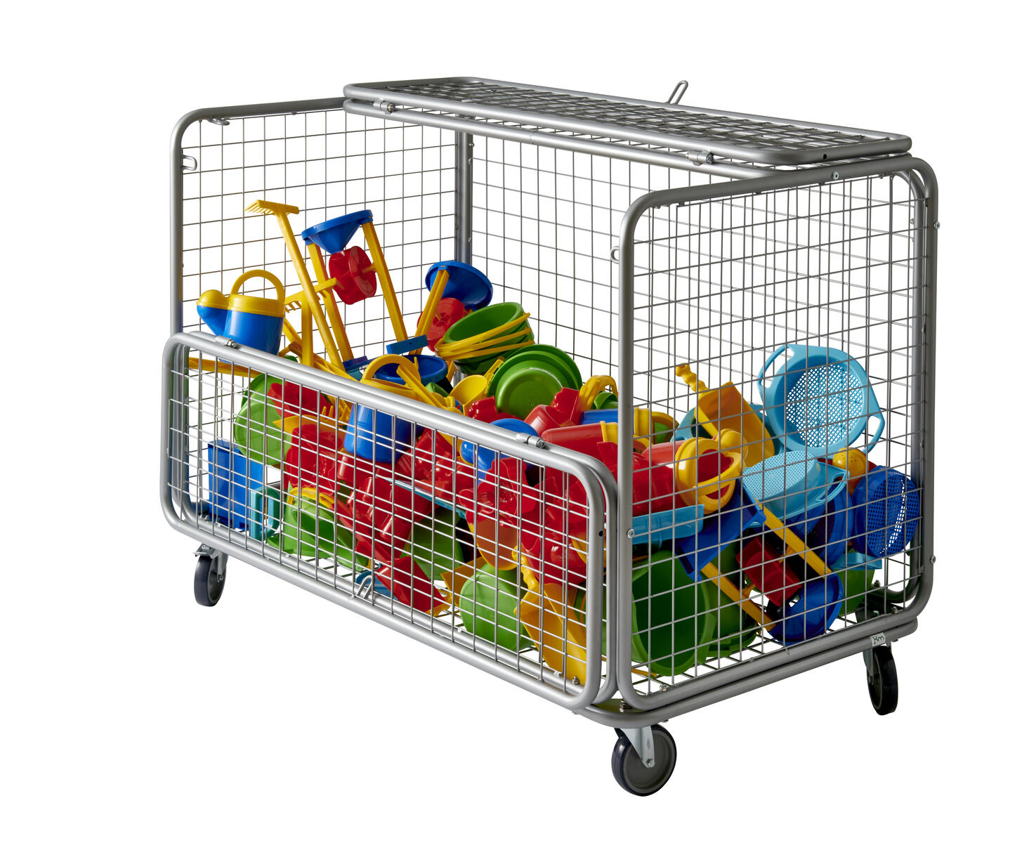 Förvaringsvagn av metall med smidig förvaringsplatta för att mindre saker inte skall trilla ut. Smart öppning som underlättar för barnen att komma åt leksaker eller bollar i vagnen. Lock kan kompletteras med hänglås (ingår ej). Med 4 hjul, varav 2 låsbara, som gör den lätt att förflytta. Mått: L118xB66xH82 cm. Pulverlackerad. 5 års garanti mot rör- eller svetsbrott. Bör förvaras under tak. Levereras monterad.