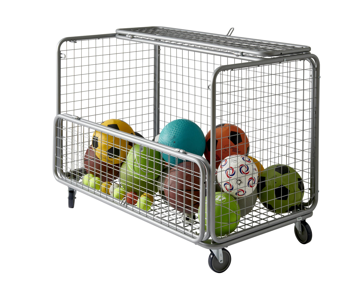 Bollvagn av metall. Praktisk förvaringsvagn för bollarna, sandleksakerna etc. Kraftig konstruktion med 2 låsbara, starka hjul. Locket kan kompletteras med hänglås (ingår ej). Mått: 94x54x90 cm. Vikt 24 kg.