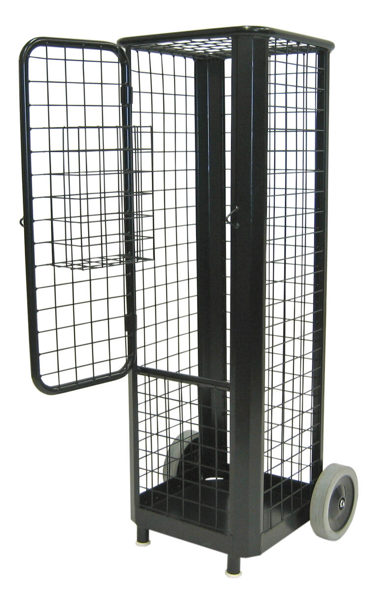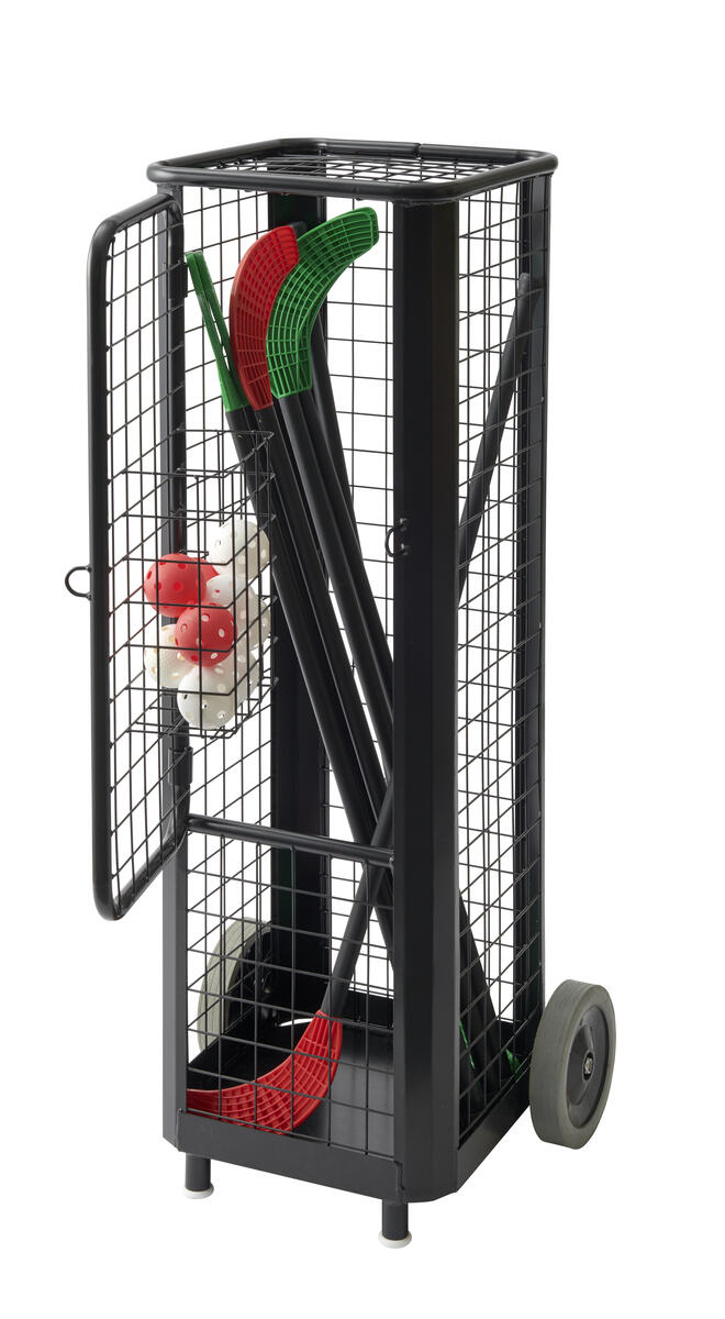 En smart förvaring till innebandyklubbor och bollar. Enkel förflyttning då vagnen har rejäla hjul på ena sidan. Dörr på framsidan. Kraftig konstruktion av metall med svetsat stålnät. Med plats för ca 40 klubbor och 10 bollar i bollfacket. Vikt 18 kg. Mått: 40x40x125 cm. Innehåll ingår ej.
