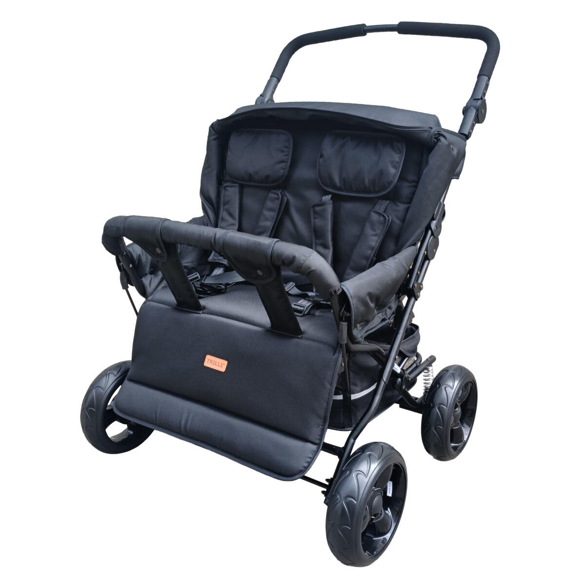 En smidig syskonvagn med reglerbart rygg- och fotstöd. Sitt- och viloläge. Levereras komplett med 5-punktssele, punkteringsfria däck och svartlackerat chassi. Vagnen har mjuk bakhjulsfjädring. Använd alltid barnsele och håll alltid uppsikt över barn som sitter i en barnvagn. Med avtagbar båge fram och rymlig varukorg. Skjutstången är reglerbar i höjd 89–109 cm. Styrets höjd 77–110 cm. Oeko-Texcertifierad PU-klädsel som är lätt att rengöra. Mått: L87xB82xH106 cm.