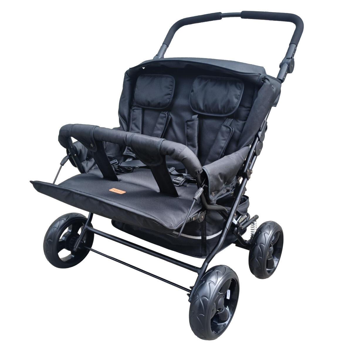 En smidig syskonvagn i textil med reglerbart rygg- och fotstöd. Sitt- och viloläge. Levereras komplett med 5-punktssele, punkteringsfria däck och svartlackerat chassi. Vagnen har mjuk bakhjulsfjädring. Använd alltid barnsele och håll alltid uppsikt över barn som sitter i en barnvagn. Med avtagbar båge fram och rymlig varukorg. Skjutstången är reglerbar i höjd 89–109 cm. Styrets höjd 77–110 cm. Oeko-Texcertifierad tygklädsel i polyester som är lätt att rengöra. Mått: L87xB82xH106 cm.