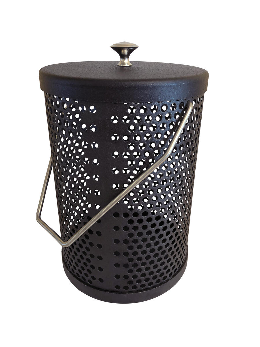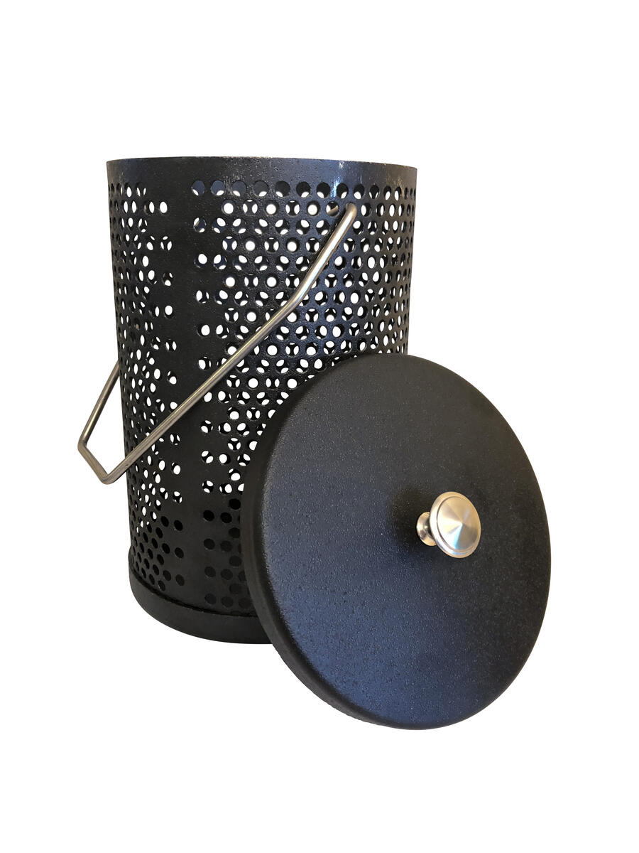 En popcorngryta med perforerade sidor och hänge så att alla kan se när majskornen poppas. Handdiskas innan användning. Använd med fördel lite matolja i bottnen vid poppning dock inget måste. Höjd 17 cm. Vikt ca. 1,5 kg.