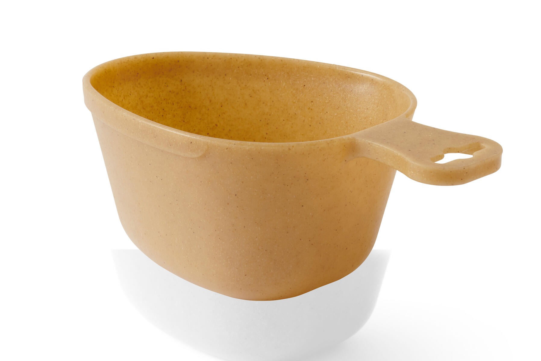 En kåsa av 100 % förnybart material utan färgtillsatser, livsmedelsgodkänd. Rymmer 4 dl. Stapelbar. Av PE baserat på sockerrör med samma hållbarhet och egenskaper som övriga plastprodukter. Diskas i övre delen av diskmaskinen.