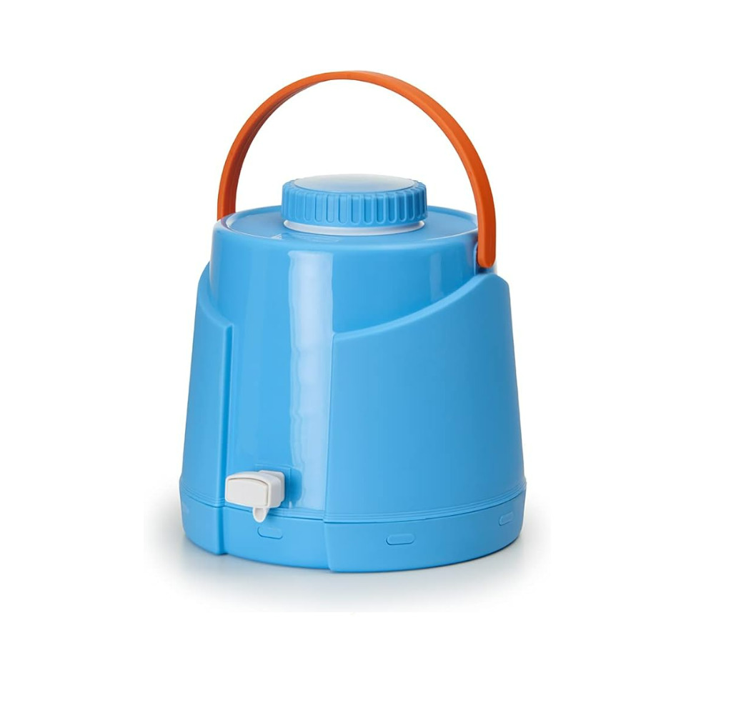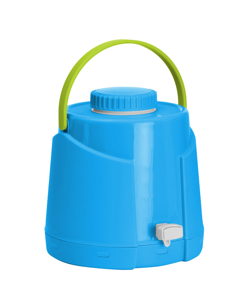 Praktisk förvaring av t.ex. dricksvatten som man vill ha kylt för uteverksamheten. Kan även användas för varma drycker. Lätt att rengöra. Rymmer 5,6 L. Mått: ø 27 cm, höjd 29 cm. Livsmedelsgodkänd. Av PP och PS.