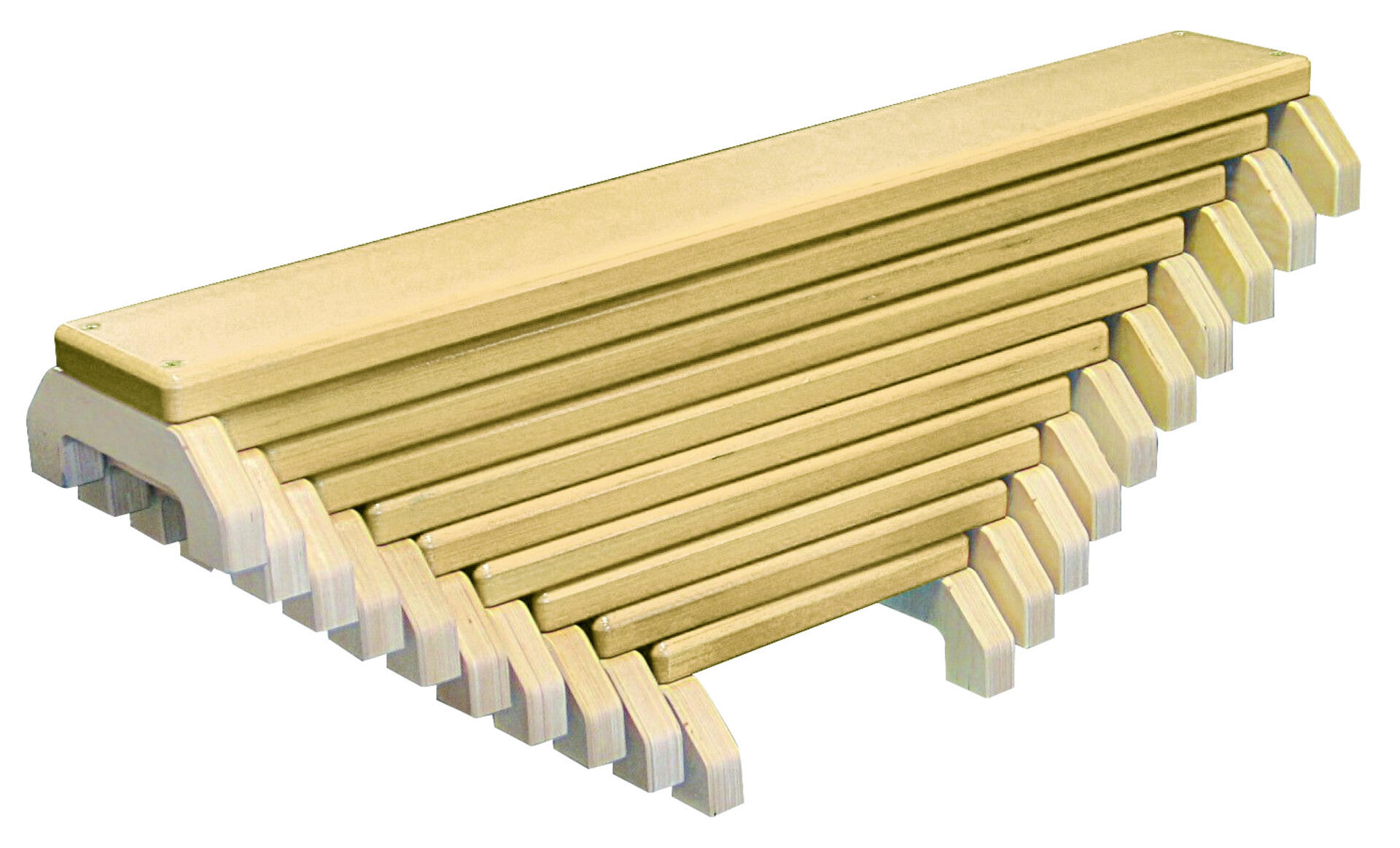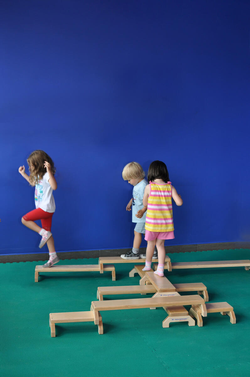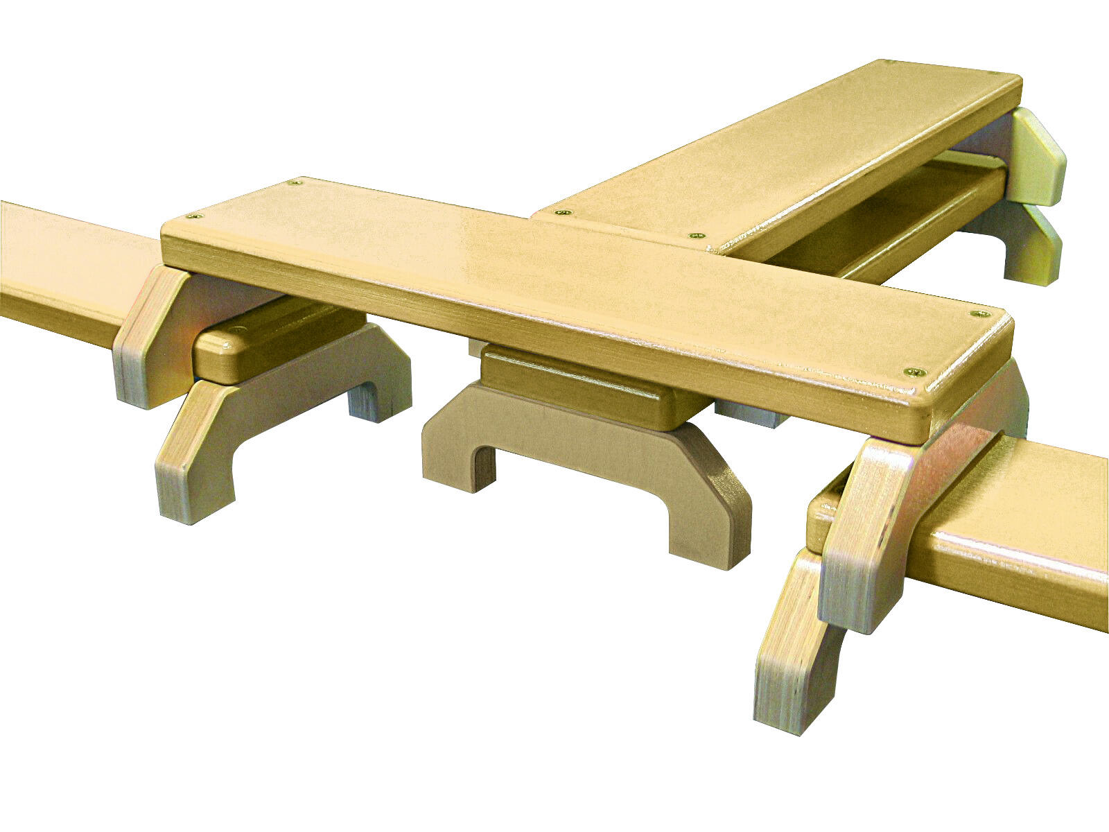 Enkla, stabila och mobila bänkar i olika längder vilket ger många möjligheter att bygga upp banor för motorik- och balansträning. Den längsta bänken är 102 cm och den kortaste är 30 cm. Höjd, 11,5 cm. Bredd 25 cm. Av 30 mm tjock klarlackad plywood.