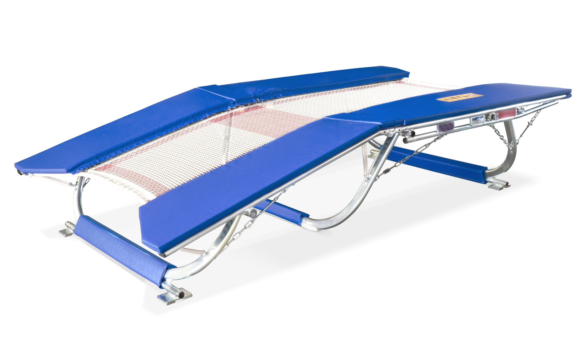 Den öppna ramkonstruktionen gör trampetten särskilt lämplig för svåra hopp. Studsmattan är mycket stabil. Mått: 120x120 cm, hoppduk 60x70 cm. Vikt: 38,5 kg.