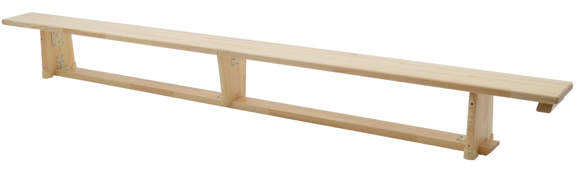 Gymnastikbänk av limmat trä. Ben och mittstöd av slitstark plywood och fötter av gummi som inte lämnar märken. Alla kanter på toppen, balken och benen är rundade. Bänken har en krok som gör att den kan hängas på en ribbstol eller i öppningen till plintarna. När bänken är vänd kan bänkbalken, 100 mm bred och 30 mm tjock, användas som balans för övningar. Alla element är målade med slitstark vattenbaserad lack. Bänkskivans mått: 3 cm tjock, 25 cm bred. Höjd: 31 cm. Bänken uppfyller kraven i EN 913.