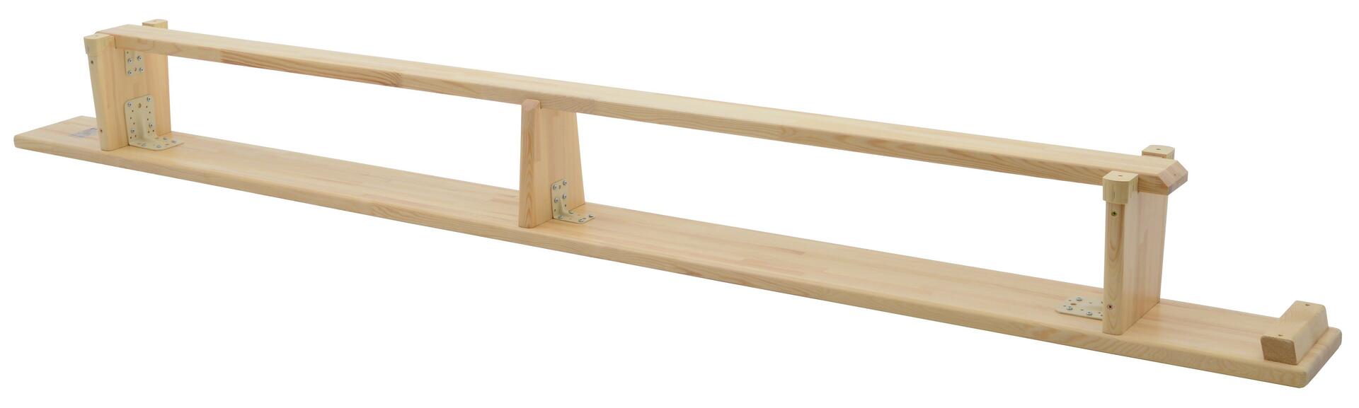 En gymnastikbänk av fingerskarvad furu med en ”klack” undertill för att kunna fästas i ribbstolar eller pallplintar. Anti-slip för att inte glida på underlaget. L300xB22xH30 cm. Balansskivan undertill är 10 cm bred. Godkänd enl. Standard PN-N-97063:1996 and PN-EN 913:2008.