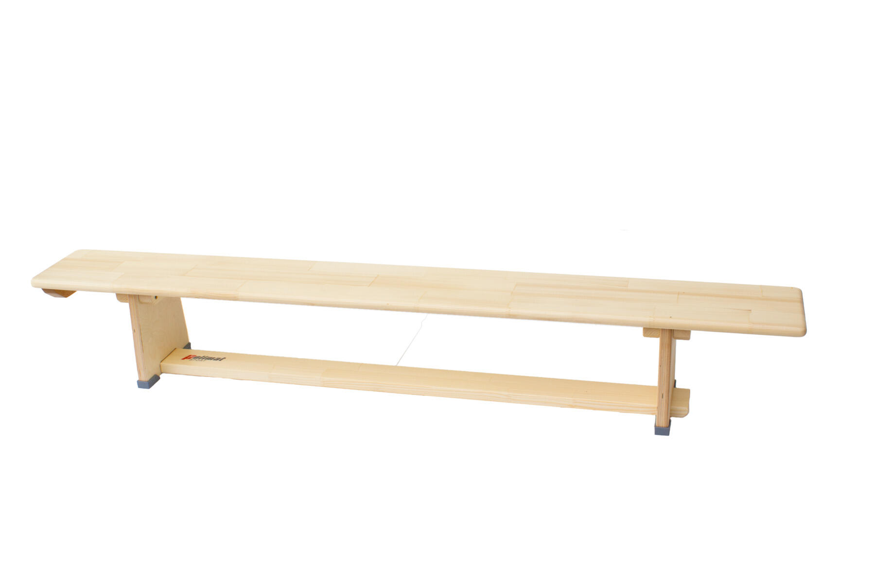Gymnastikbänk av limmat trä. Ben och mittstöd av slitstark plywood och fötter av gummi som inte lämnar märken. Alla kanter på toppen, balken och benen är rundade. Bänken har en krok som gör att den kan hängas på en ribbstol eller i öppningen till plintarna. När bänken är vänd kan bänkbalken, 100 mm bred och 30 mm tjock, användas som balans för övningar. Alla element är målade med slitstark vattenbaserad lack. Bänkskivans mått: 3 cm tjock, 25 cm bred. Höjd: 31 cm. Bänken uppfyller kraven i EN 913.