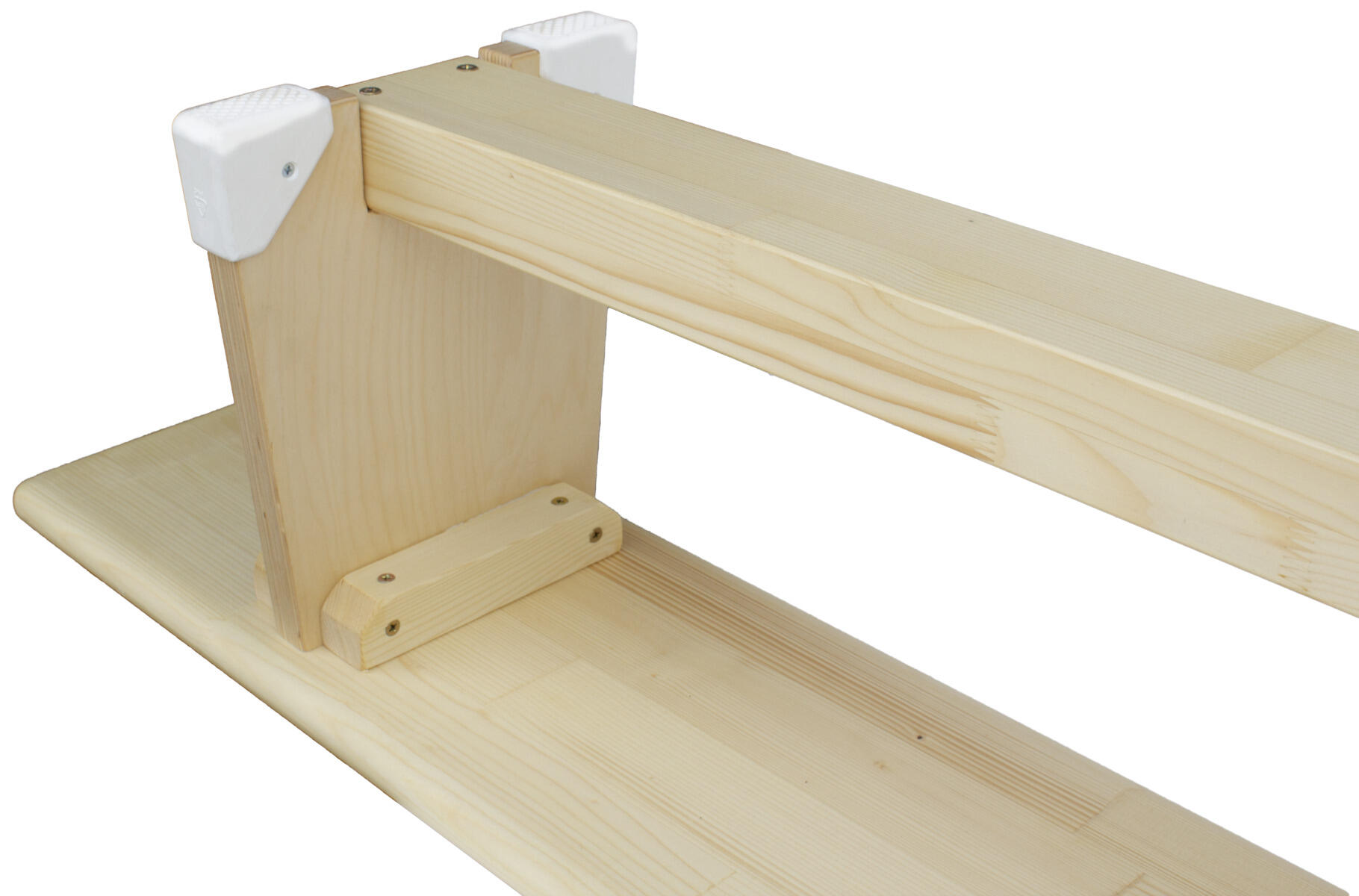 En gymnastikbänk av fingerskarvad furu med en ”klack” undertill för att kunna fästas i ribbstolar eller pallplintar. Anti-slip för att inte glida på underlaget. L300xB22xH30 cm. Balansskivan undertill är 10 cm bred. Godkänd enl. Standard PN-N-97063:1996 and PN-EN 913:2008.