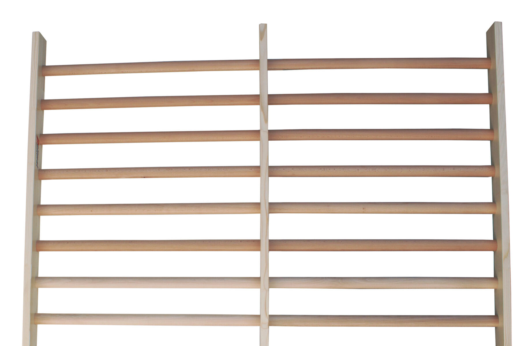 Ribbstol med väggribbor som är tillverkade av limmat trä och stegpinnar av bokträ. Ytan är täckt med en slitstark, miljövänlig lack. Stegpinnar med ovalt tvärsnitt 43x33 mm. 260x180 cm. Uppfyller EN 913.