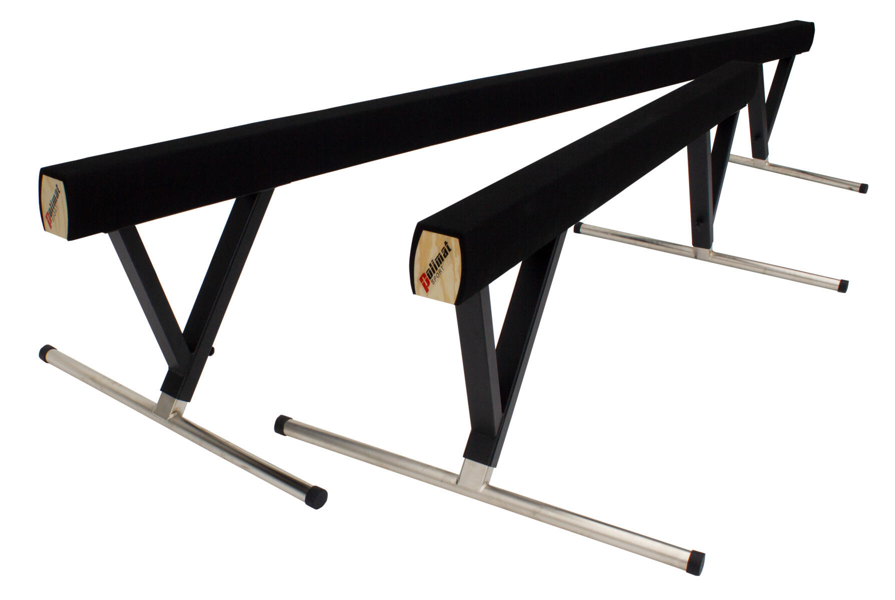 Balansbom med justerbar höjd 80-120 cm. 5 meter lång och uppfyller kraven för tävling. Av limmad träbalk klädd med halkfritt material. Uppfyller EN 12432.