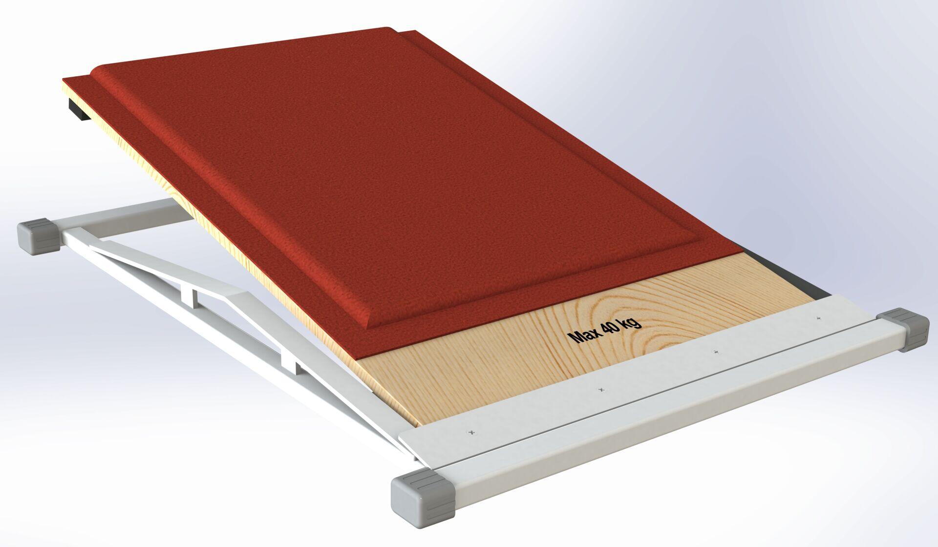 Satsbräda som är avsedd för barn med en vikt upp till 40 kg. Konstruktionen är tillverkad av en metallbas och plywood i lövträ täckt med heltäckningsmatta, dessutom utrustad med ett lager av skum. Underdelen är utrustad med halkfria, icke-märkande gummikuddar. Mått: 93x74x24 cm. Testad enligt PN-EN 913+A1:2022-02.