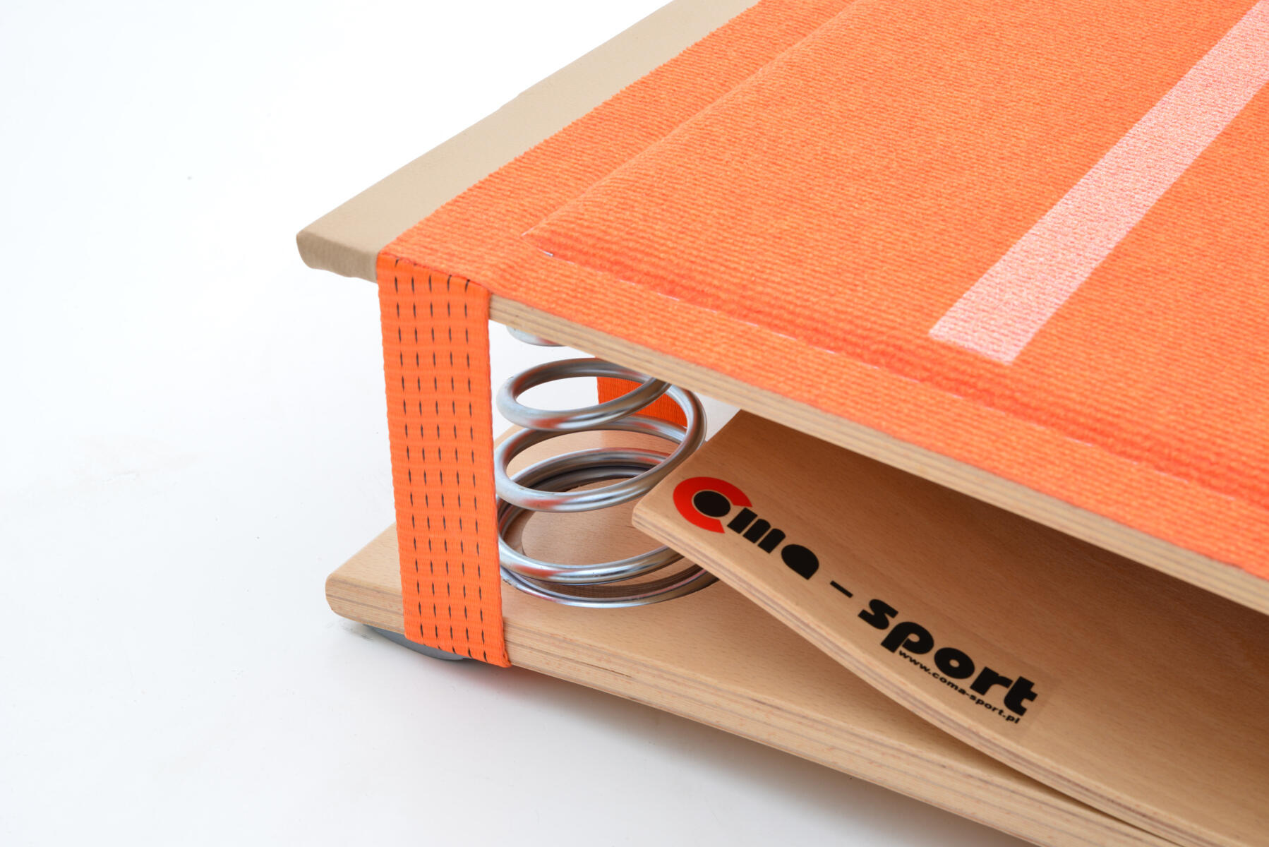Satsbräda med konstruktion som är tillverkad av specialgjutna lövträ-plywoodelement och är utrustad med två extra konformade, kraftiga stålfjädrar för ökad hoppdynamik. Satsbrädan har en stoppad matta och under mattan har det dessutom placerats ett lager av återvunnet skum för att säkerställa att springboarden har goda stötdämpande egenskaper. Den nedre delen är utrustad med halkfria, icke-märkande gummikuddar som ger utmärkt stabilitet och golvskydd. Mått: 120x60x21 cm. Testad enligt PN-EN 913:2019-03.