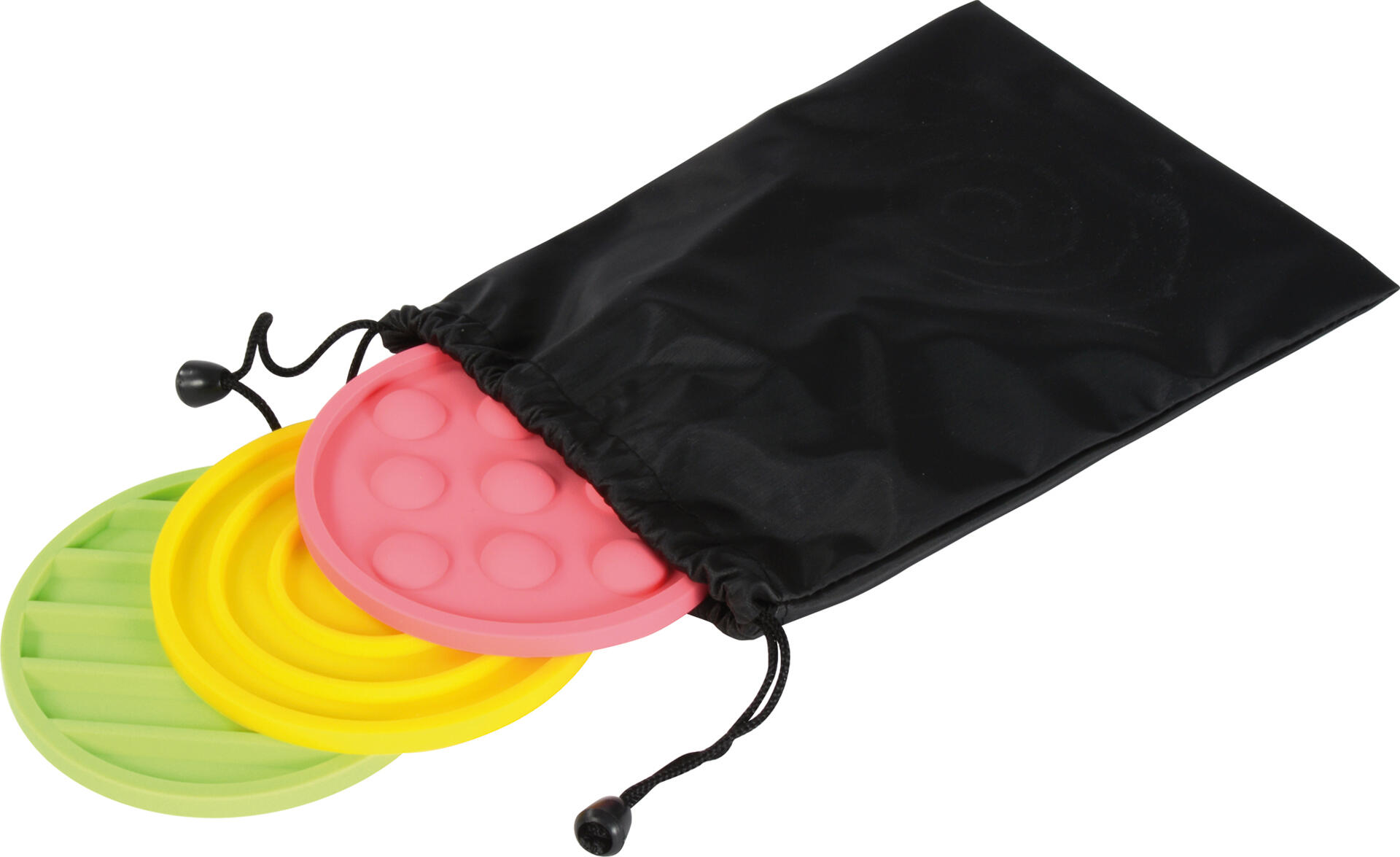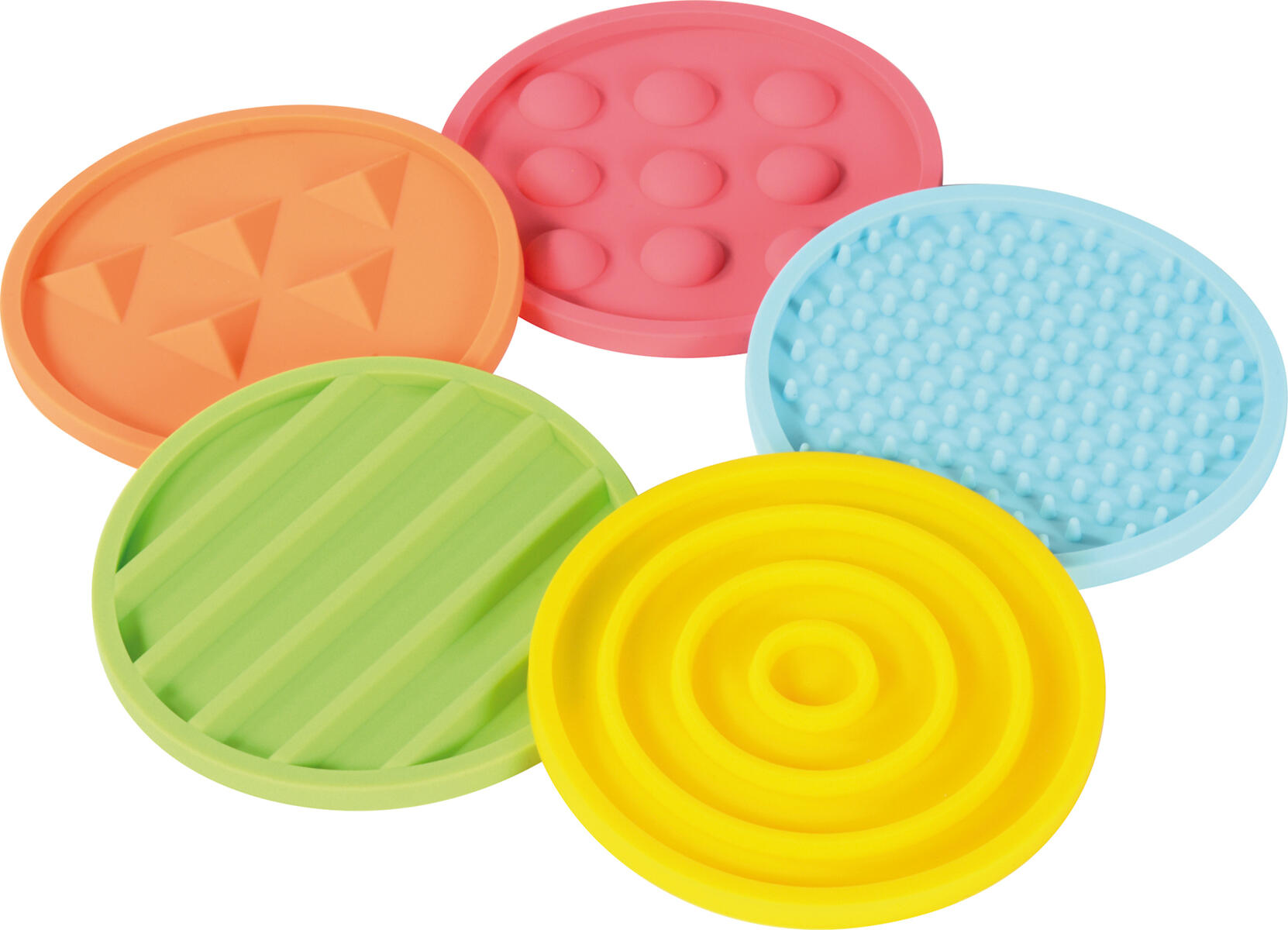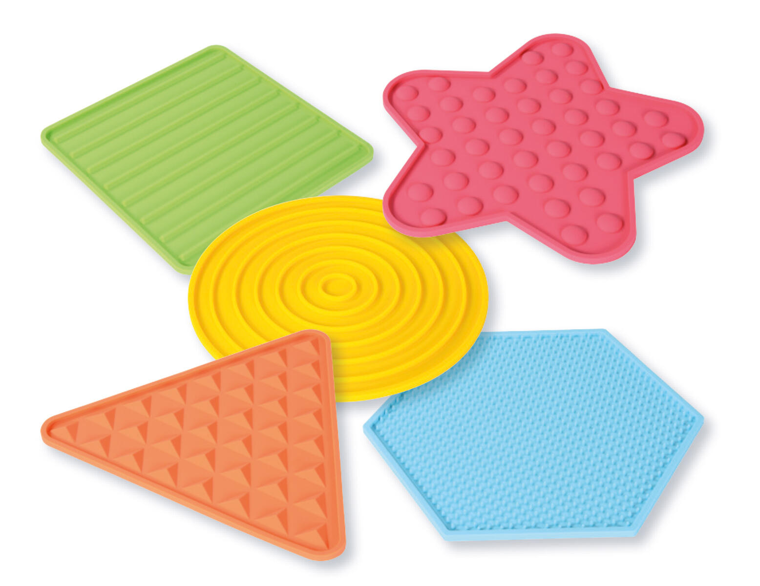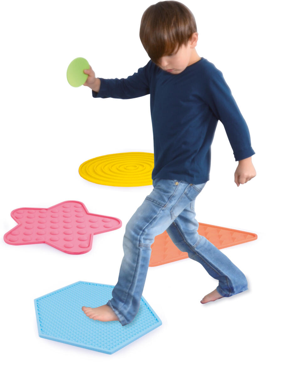 10 st/fp. Markeringsplattor i olika former och storlekar med olika strukturer. Bygg banor eller lek känsellekar där barnet tar ut en silikonmatta ur påsen utan att titta. Efter att ha känt på ytan försöker de hitta samma struktur på en stor silikonmatta med fötterna. Plattorna är halkfria och kan enkelt rengöras med vatten. Setet består av 5 stora och 5 små plattor. Påse medföljer till de små plattorna. Av silikon. PVC-fri. Från 3 år.