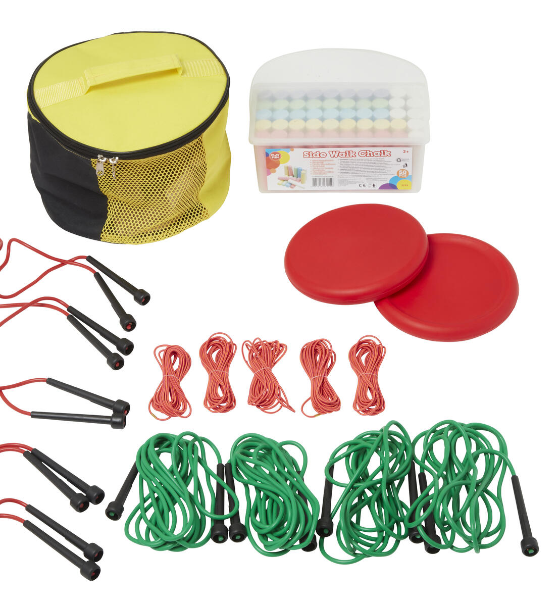 Ett roligt motorikpaket med 5 hopprep, 4 långrep, 1 fp gatukritor, 5 twistband, 2 mjuka frisbee samt en praktisk förvaringsväska.