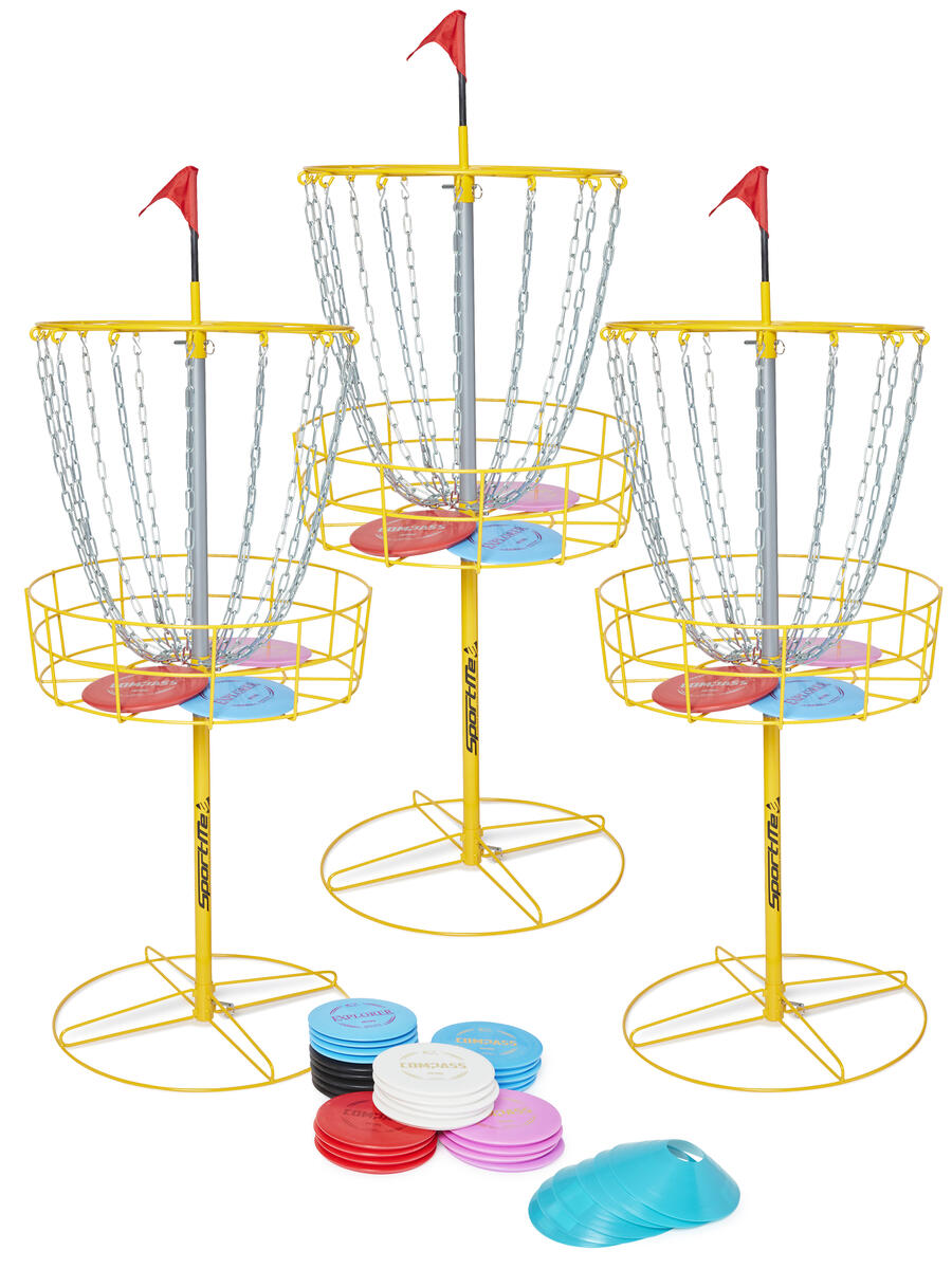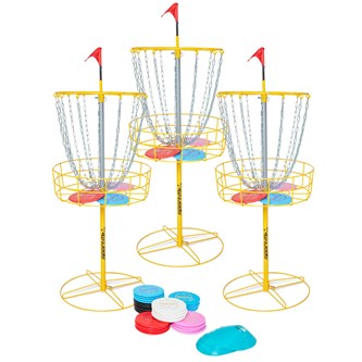 I detta set finns det som behövs för att sätta ihop sin egen portabla discgolfbana. Setet innehåller 3 flyttbara discgolfkorgar, 20 midrangediscar, 5 putterdiscar samt 5 driverdiscar. Samtliga discar är PDGA-godkända.