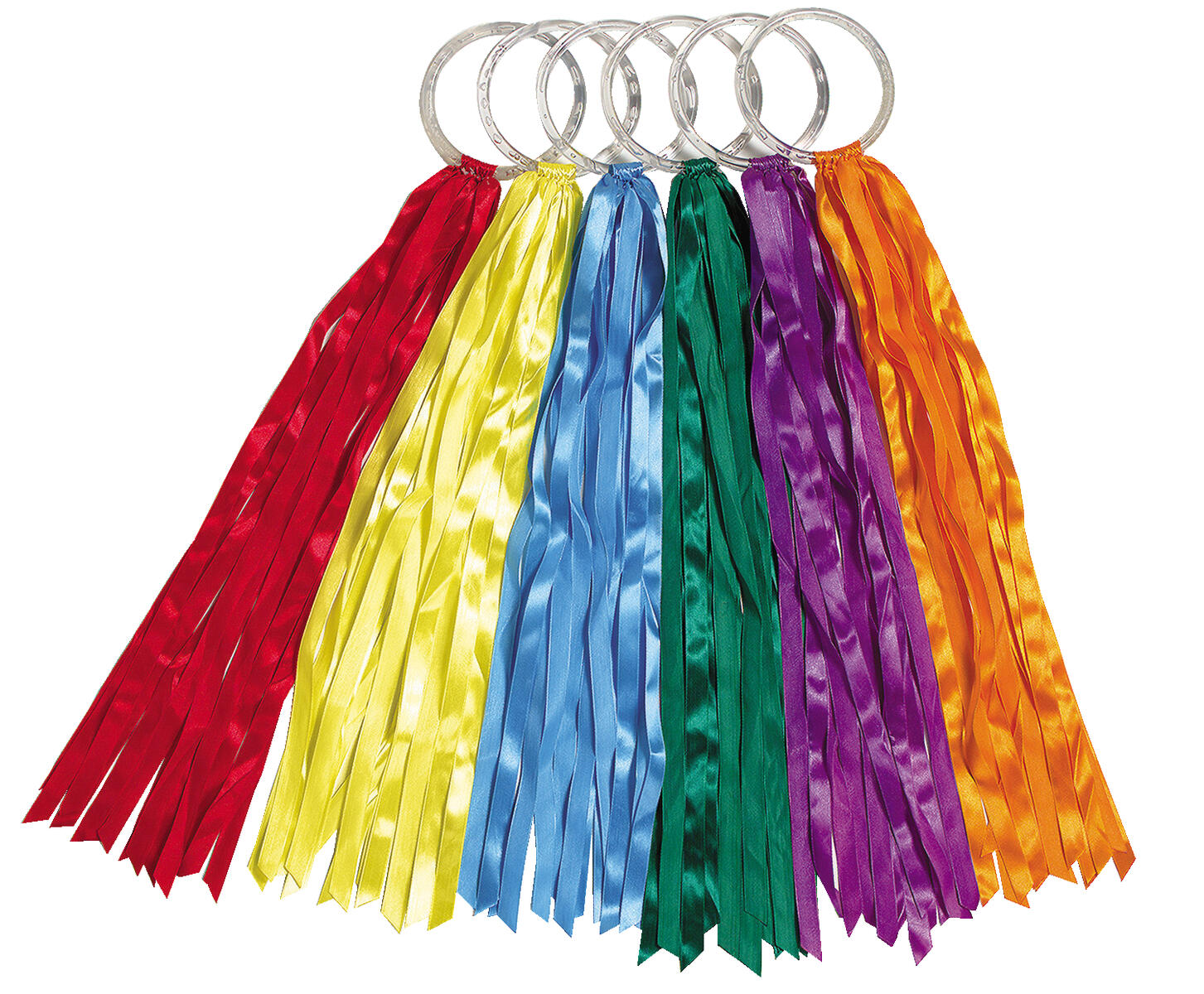 6 st/fp. Barnen kan göra vackra, strömmande rörelser som ger en visuell upplevelse. Lätta att greppa. Plastringen är nästan osynlig vilket gör att banden ser ut att flyga fritt i luften. Säljs i en fp om 6 färger. Längd: 30 cm. Banden är av nylon och ringarna av polypropen. PVC-fri.