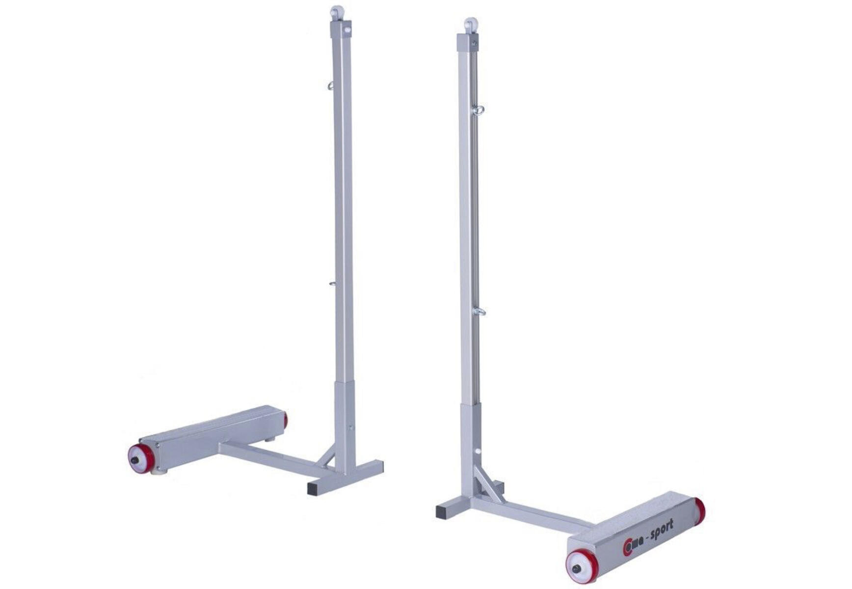 Ett par fristående badmintonstolpar med motvikt. Har hjul på motvikten för att enkelt kunna flyttas. Av pulverlackerad aluminium, antislip samt fötter som inte ger märken i underlaget. Motvikt 25 kg av stål.