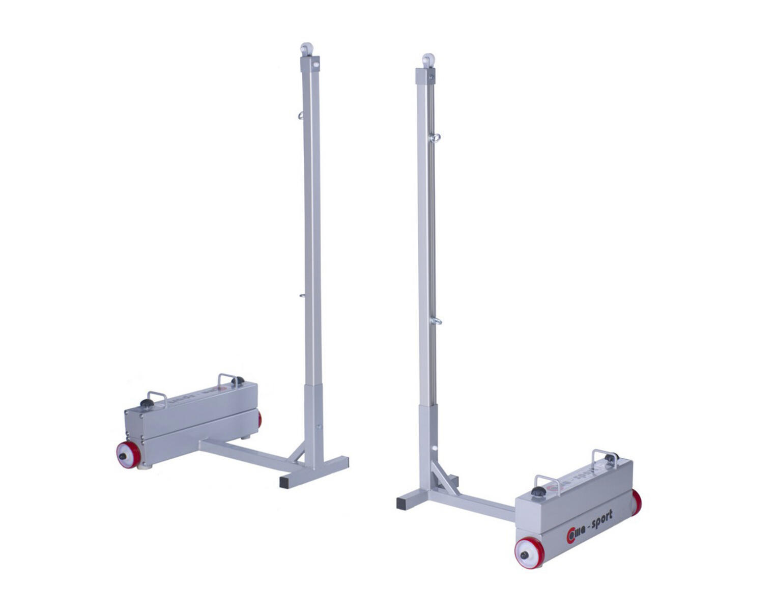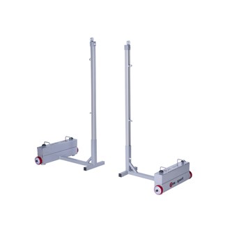 Ett par fristående badmintonstolpar med motvikt och hjul för enkel förflyttning. Av pulverlackerad aluminium. Med antislip samt fötter som inte ger märken i underlaget. Motvikt 25+25 kg av stål.