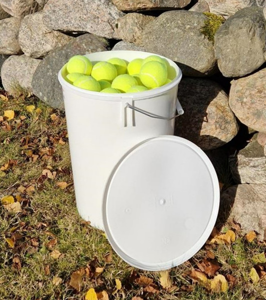 60 tennisbollar samt en hink på 20 liter att förvara dem i.