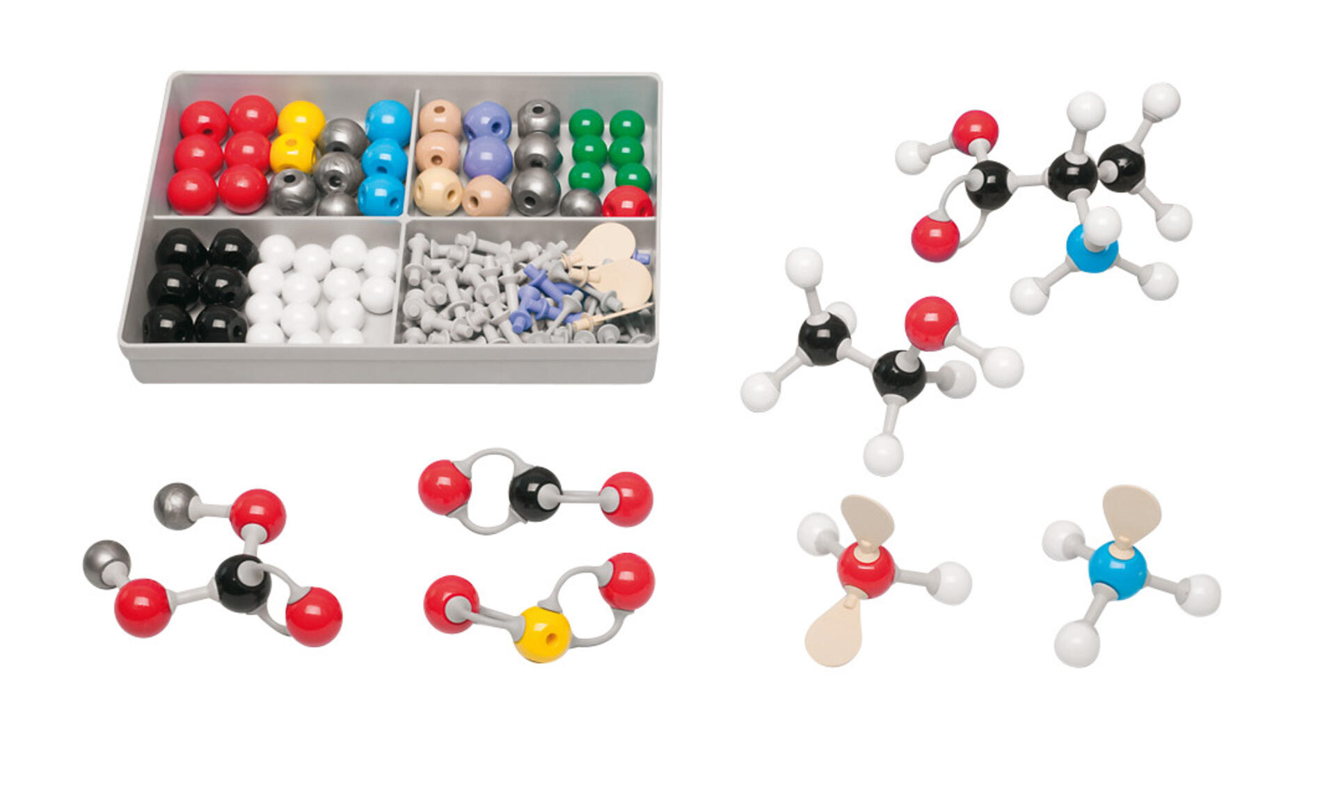 Molekylmodeller för grundläggande arbete med organisk och oorganisk kemi: Kalcium, magnesium, beryllium, tre olika metallatomer (III-, IV- och V-värdiga), halogener, syre, bor, kväve, svavel, fosfor, väte och kol. I satsen finns atomer med hål för olika antal bindningar.