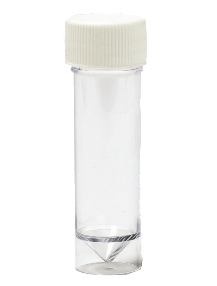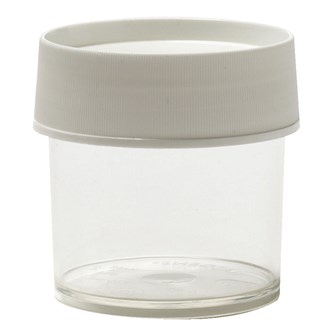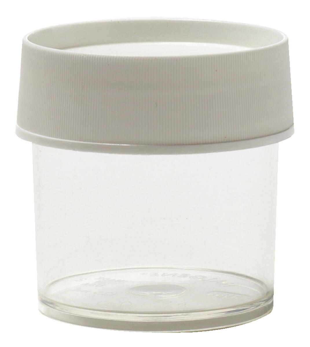 PS-plast, ej värmebeständig. Mått: ytterdiameter 2,5 cm, höjd 9,1 cm