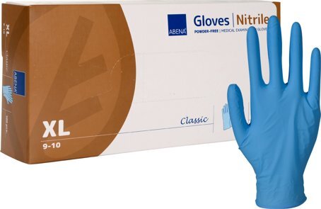 100 st/fp. Engångshandskar av nitril, elastiska med full rörelsefrihet. För rengöring, livsmedelsbearbetning, patientvård, hantering av kemikalier etc. Storlek: XL. Puderfri.