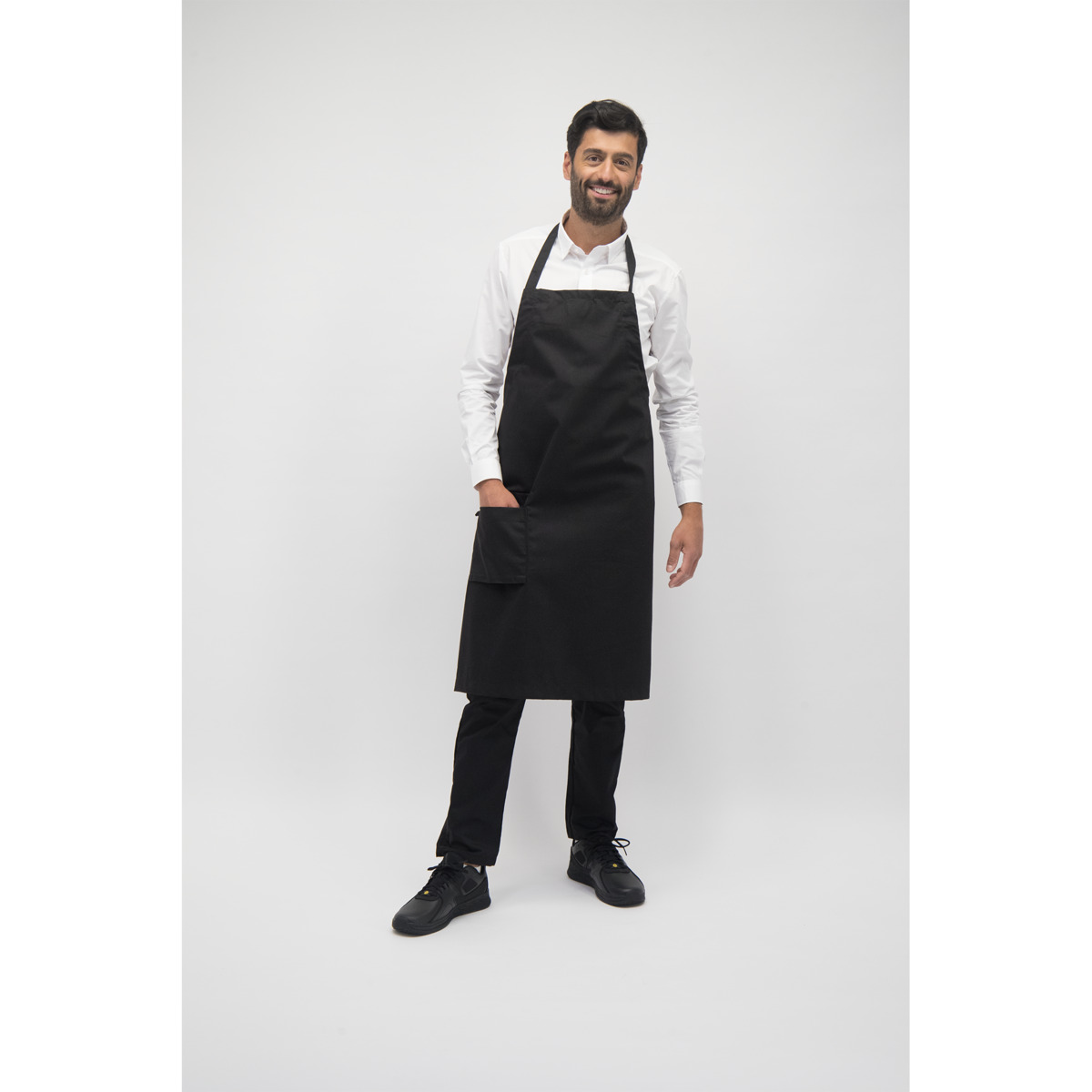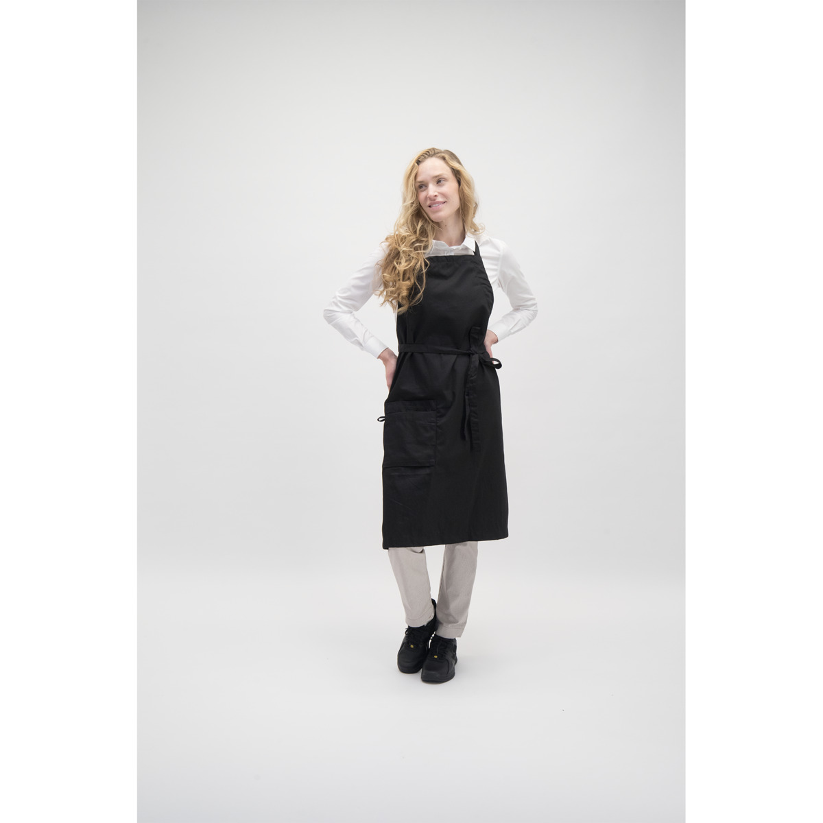 Bröstlappsförkläde med kanalstickat nack- och midjeband för bästa passform. Dubbelficka på höger sida med bälg och nyckelhälla. Hank för upphängning, en storlek passar S-XL. Mått: 90x95 cm. Av 65 % polyester, 35 % bomull som är OEKO-TEX®-certifierad, klass II (Standard 100) och OEKO-TEX® MADE IN GREEN.