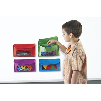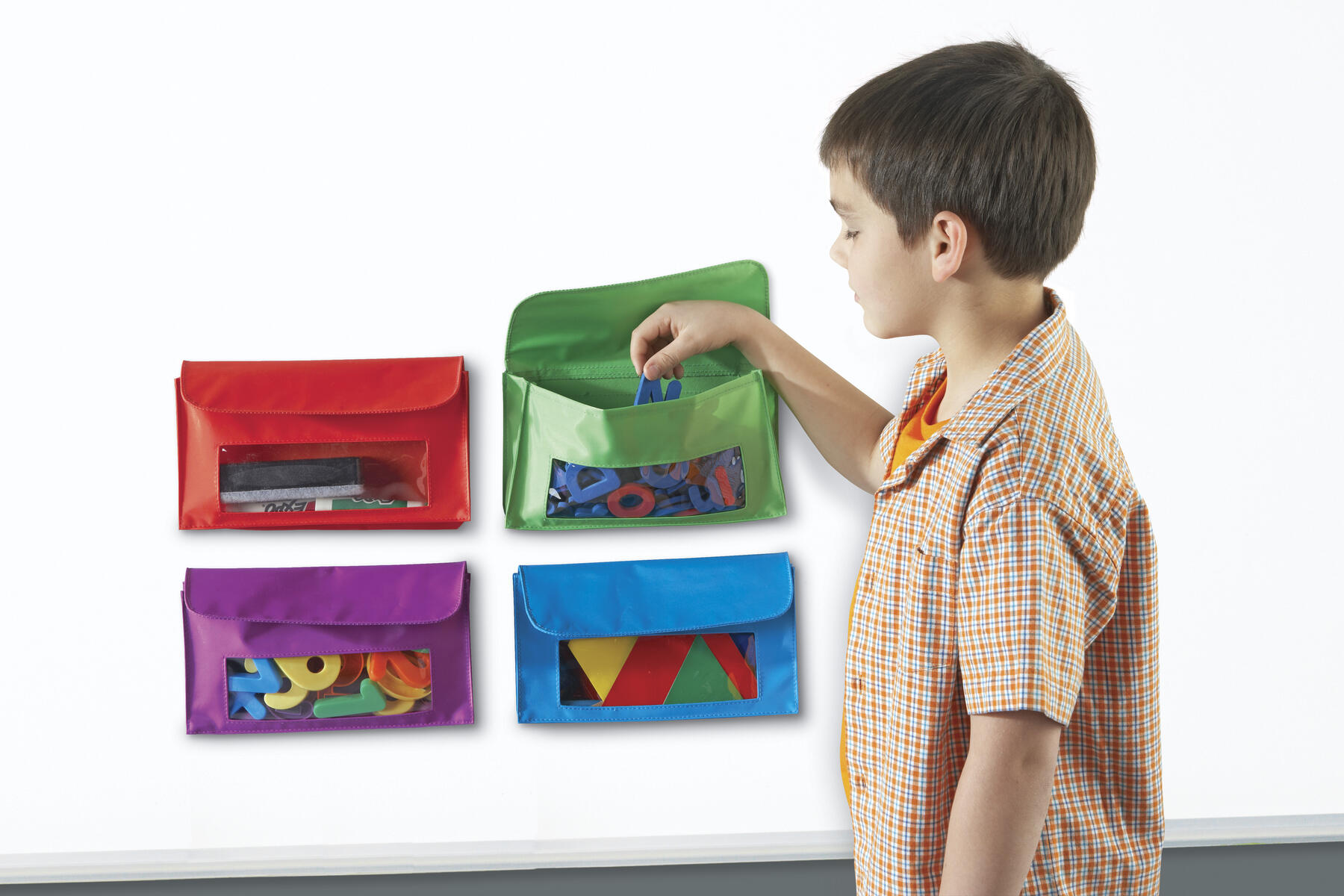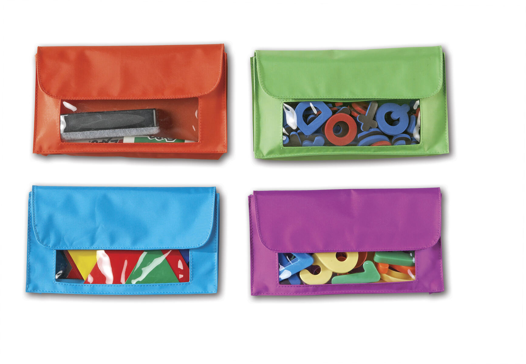 4 st/fp. Smarta förvaringsfickor i 4 färger med ett transparent fönster för att man enkelt ska kunna se innehållet. Perfekta för smart organisation vid din whiteboard av t.ex. pennor, tavelsudd, siffror, geometriska figurer och klockor. Fickorna är magnetiska och kan förvara max 350 g var. Mått: 23x14 cm. Av nylon. PVC-fri.