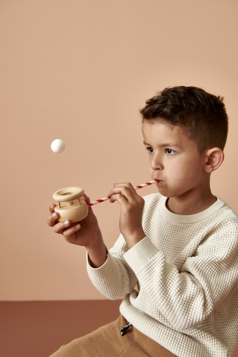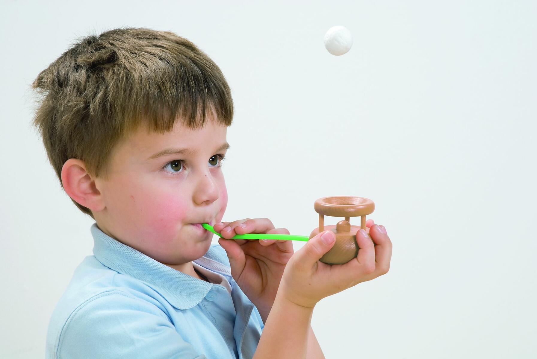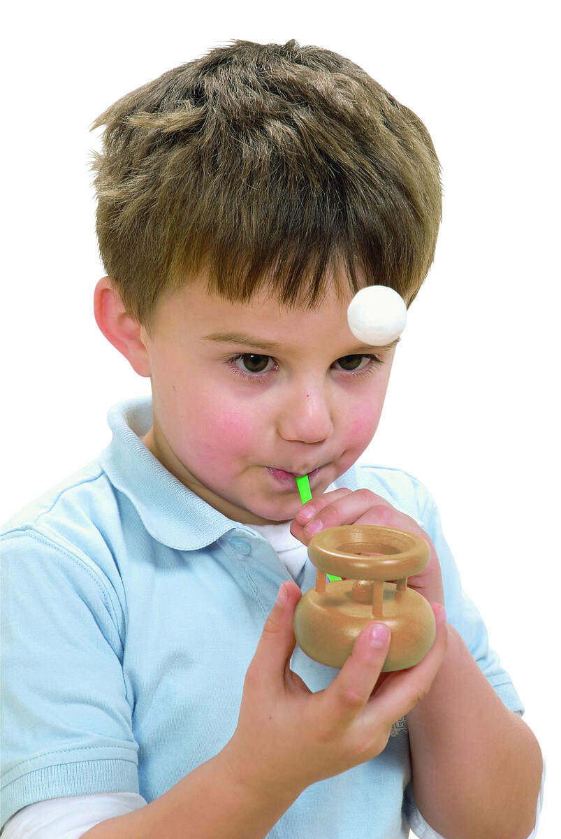 Stoppa in sugröret i den lilla träbehållaren så att en pipa bildas och lägg frigolitkulan på toppen så kan du genom att blåsa olika kraftigt få kulan att lyfta och sedan ramla tillbaka i behållaren igen. Tränar bl.a. munmotorik och luft-/andningskontroll. Övningen är också lugnande och stimulerar koncentrationen. Innehåller en behållare i trä med mått 6x5 cm, 2 frigolitkulor ø 2,3 cm och 10 sugrör. När sugrören är slut kan de ersättas av andra sugrör med samma omkrets. PVC-fri. Från 3 år.