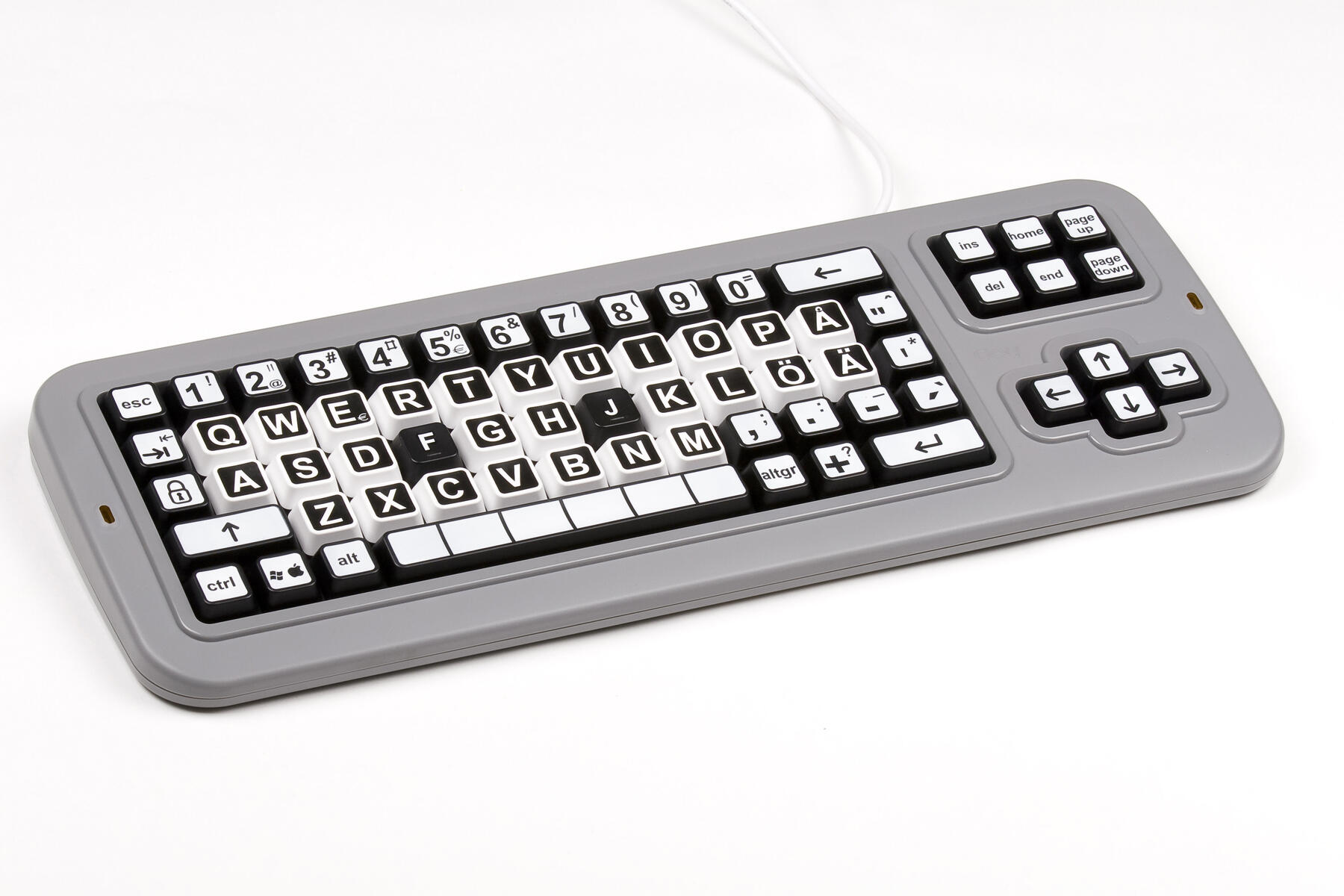 Clevy tangentbord är utvecklat för skola, samt barn och vuxna med speciella behov (exempelvis synsvaga, personer med dyslexi, motoriska funktionssvårigheter etc.). Clevy är ett mekaniskt tangentbord som har invändiga stålramar och varje enskild tangent kan hantera över 60 miljoner tangenttryckningar. Mekaniska tangentbord erbjuder mer ljud och taktil feedback, än membrantangentbord. Färgsättningen gör att de med endast 10% synförmåga kan orientera sig på detta tangentbord. Tangenterna är fyra gånger större än de på ett vanligt tangentbord. I tillägg är symbolerna på tangenterna förstorade så att det är lättare att identifiera de olika bokstäverna och siffrorna. Antalet tangenter på Clevy tangentbord är betydligt färre än antalet på ett standard tangentbord. De tangenter som används sällan (som F1-F12, PrtSc etc) är borttagna så att man kan fokusera på de som är viktiga för att skriva osv. De återfinns dock som softkeys på PCn vid behov. Clevy har ett inbyggt vätskeskydd som gör att spill på tangentbordet dräneras ut genom hål i botten av tangentbordet. Alla tangenter har en upphöjd ”vall” för att motverka att spill rinner ner till den känsliga elektroniken inuti själva tangentbordet. Clevy tangentbord är också betydligt lättare att rengöra än konventionella tangentbord och kan också fungera på sjukhus, VC etc. Tangentbordet är 100 gånger starkare än ett vanligt tangentbord. Detta gör att det tåler mycket tuffare behandling och ägnar sig därför mycket bra till barn, skola eller användning på institutioner. Tangentbordet är WiN/ PC/MAC/Ipad kompatibelt. För koppling till iPad, använd adapter, t ex 132735. Mått: 48x18x3,5 cm.