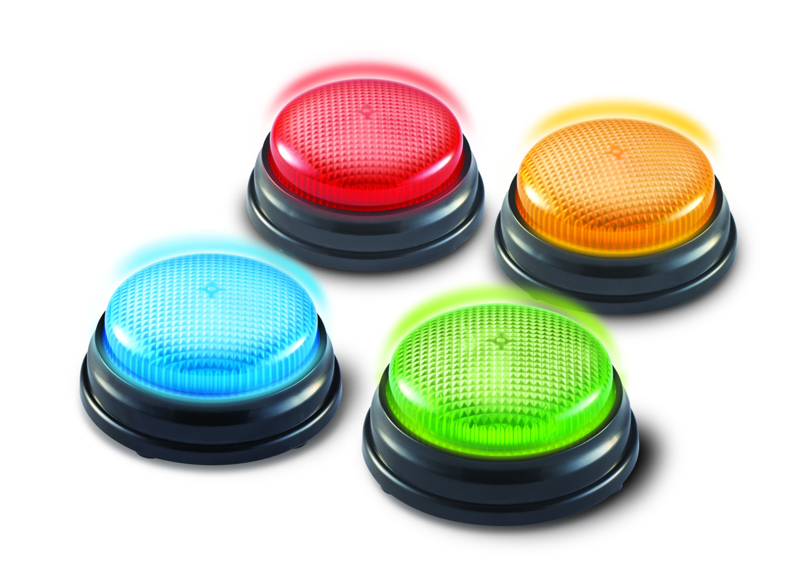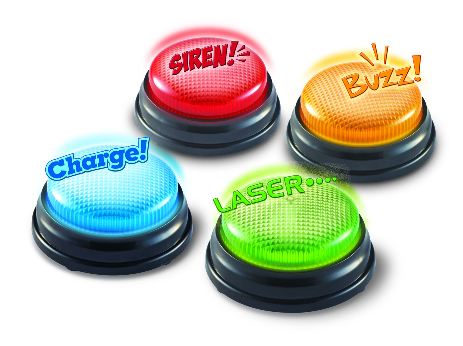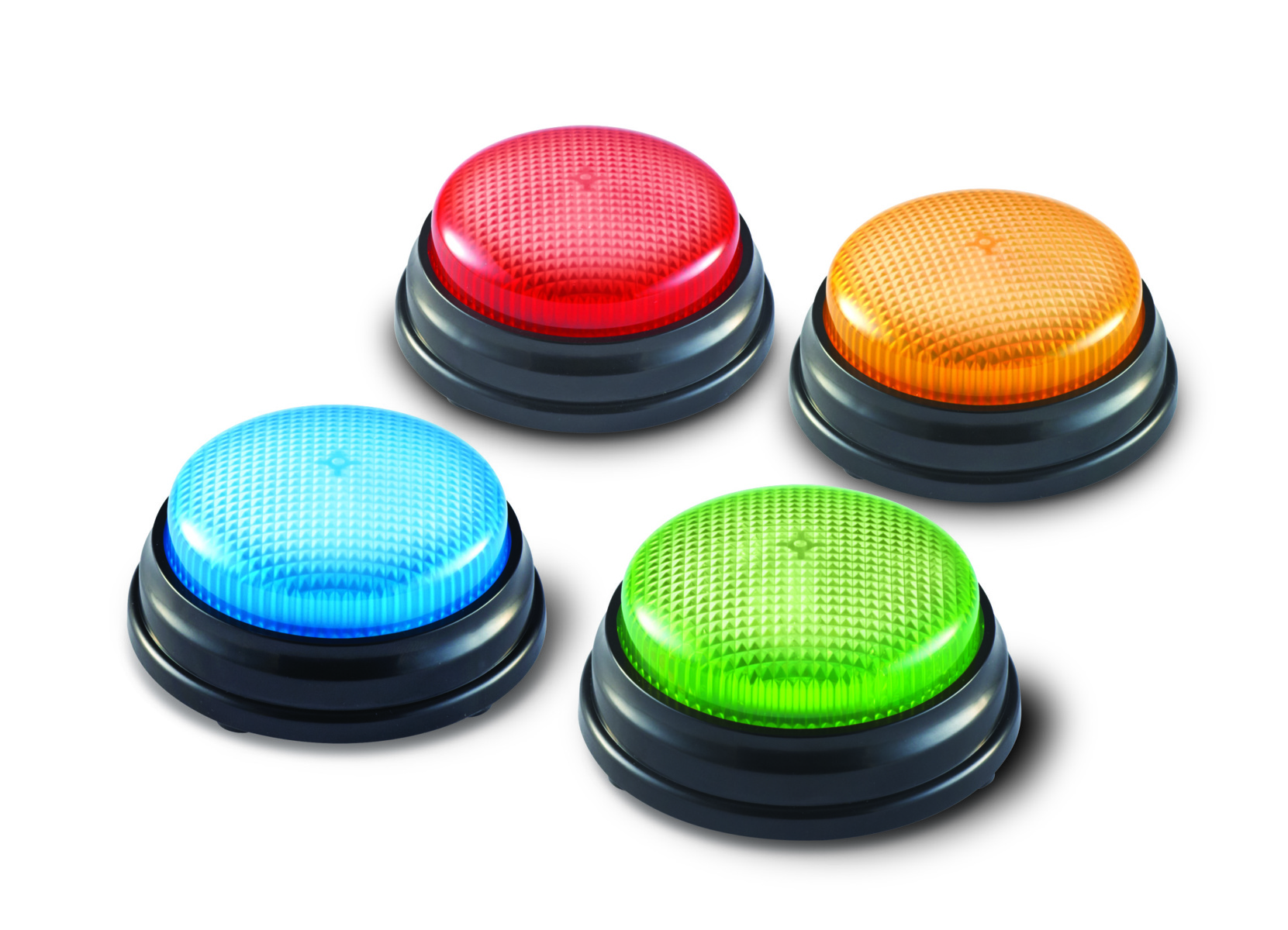 4 st/fp. Knappar som kan användas för att uppmärksamma att man behöver hjälp, eller vid frågesporter på lektioner eller i spel. Varje färg har ett unikt ljud. Mått: ca 9 cm. Kräver 2 st AAA-batterier (ingår ej). Från 3 år.