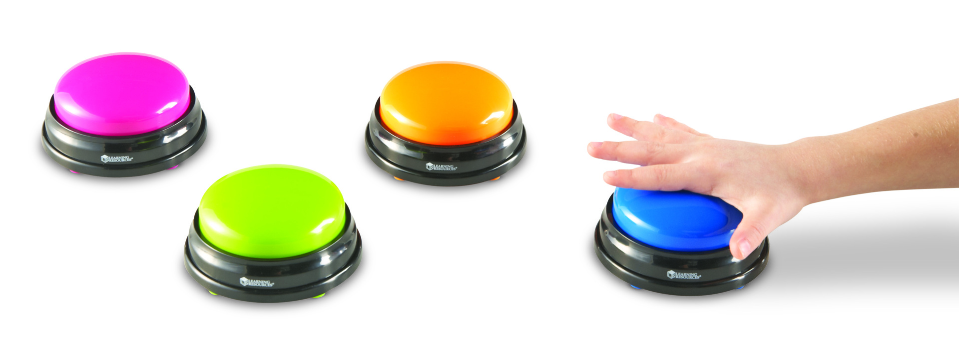 4 st/fp. Knappar som både lyser och låter och gör lektioner och lekar roligare. Kan också användas för att uppmärksamma att man behöver hjälp. Varje färg har ett unikt ljud. Mått: ca 9 cm. Kräver 2 st AAA-batterier (ingår ej). Från 3 år.