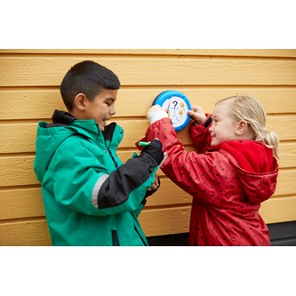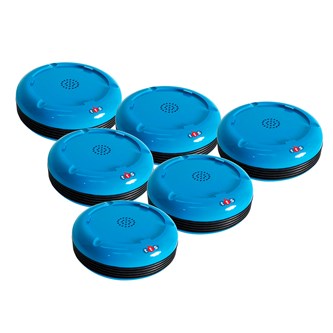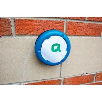 Sex tåliga stora knappar för utomhusbruk. 30 sekunders inspelningstid med stark ljudåtergivning för att höras i en bullrig utomhusmiljö. Perfekta att användas vid tipspromenader och utematte. Plattorna kan fästas på vägg och är vattentåliga men vi rekommenderar att de förvaras inomhus mellan övningstillfällena. Kräver 3 x AAA-batterier (ingår ej). Från 3 år.