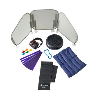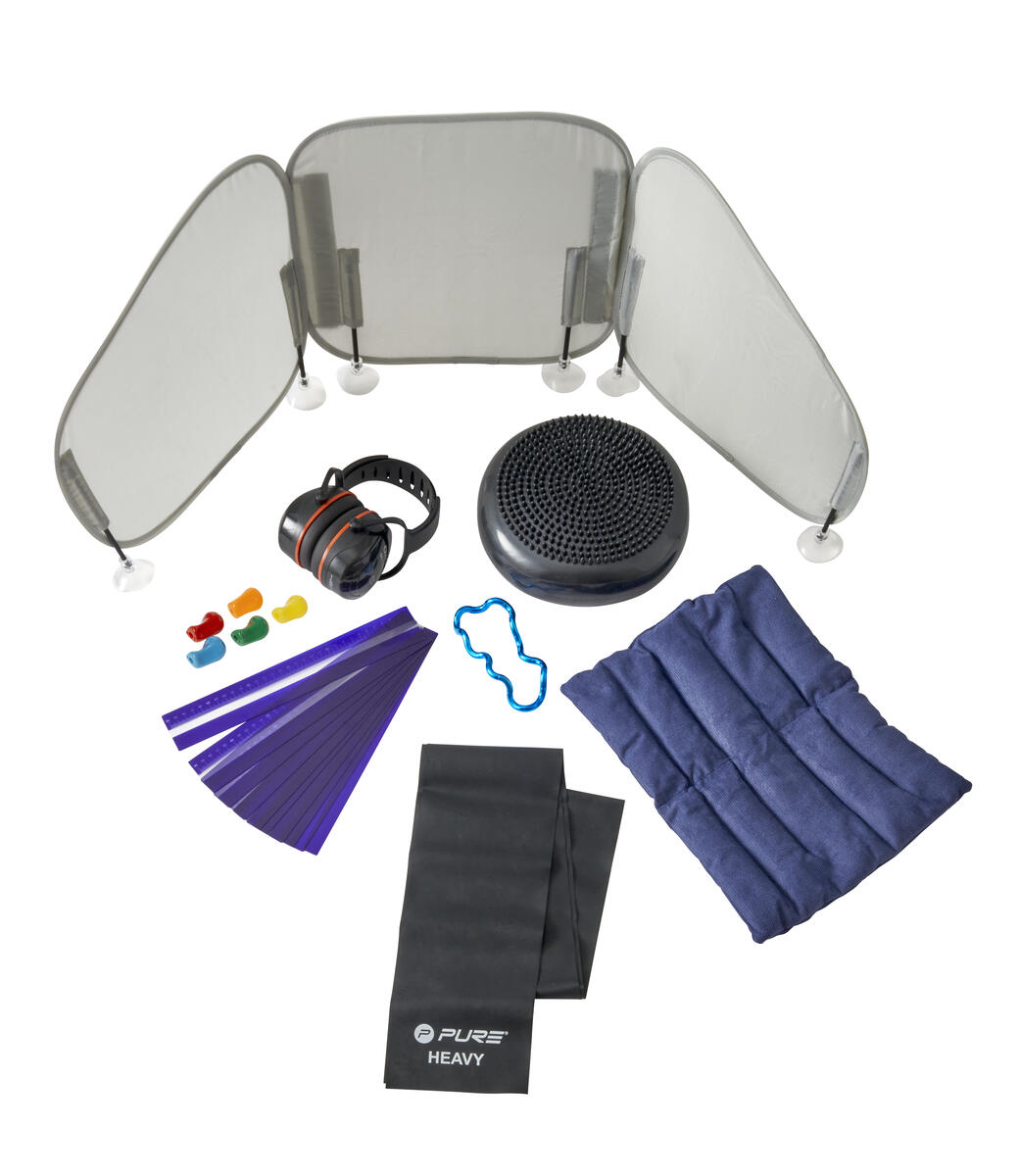 En stor sats med hjälpande produkter i klassrummet för att behålla koncentrationen på topp; stressbollar/knådbollar, kooshbollar, tangles, nopprullar, knädyna med vikt, penngrepp, massageluftkudde, hörselkåpor samt förvaringskorg. Innehållet kan variera.