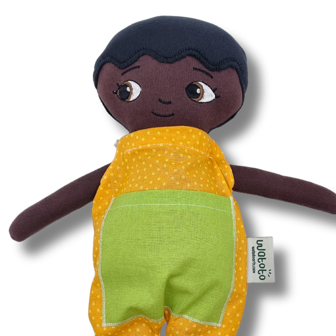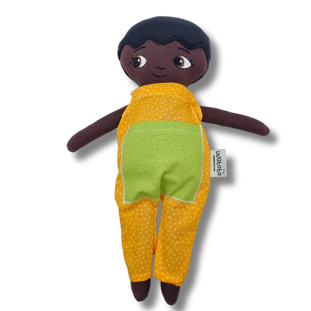 En mjuk docka av tyg med en avtagbar grön och gul jumpsuit. Dockan är kramvänlig och har ett snällt ansiktsuttryck. Maskintvätt 30°. Mått: 36 cm. Från 0 år.
