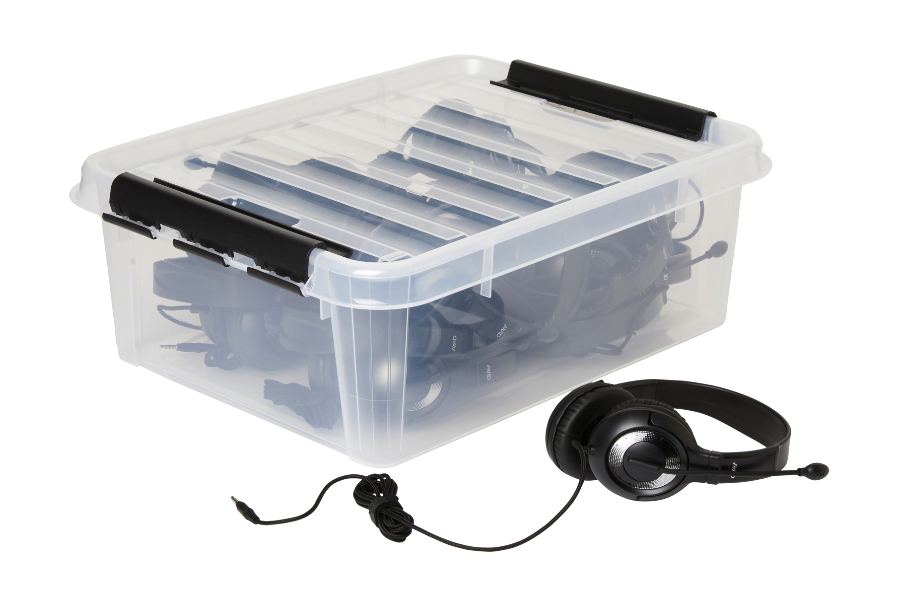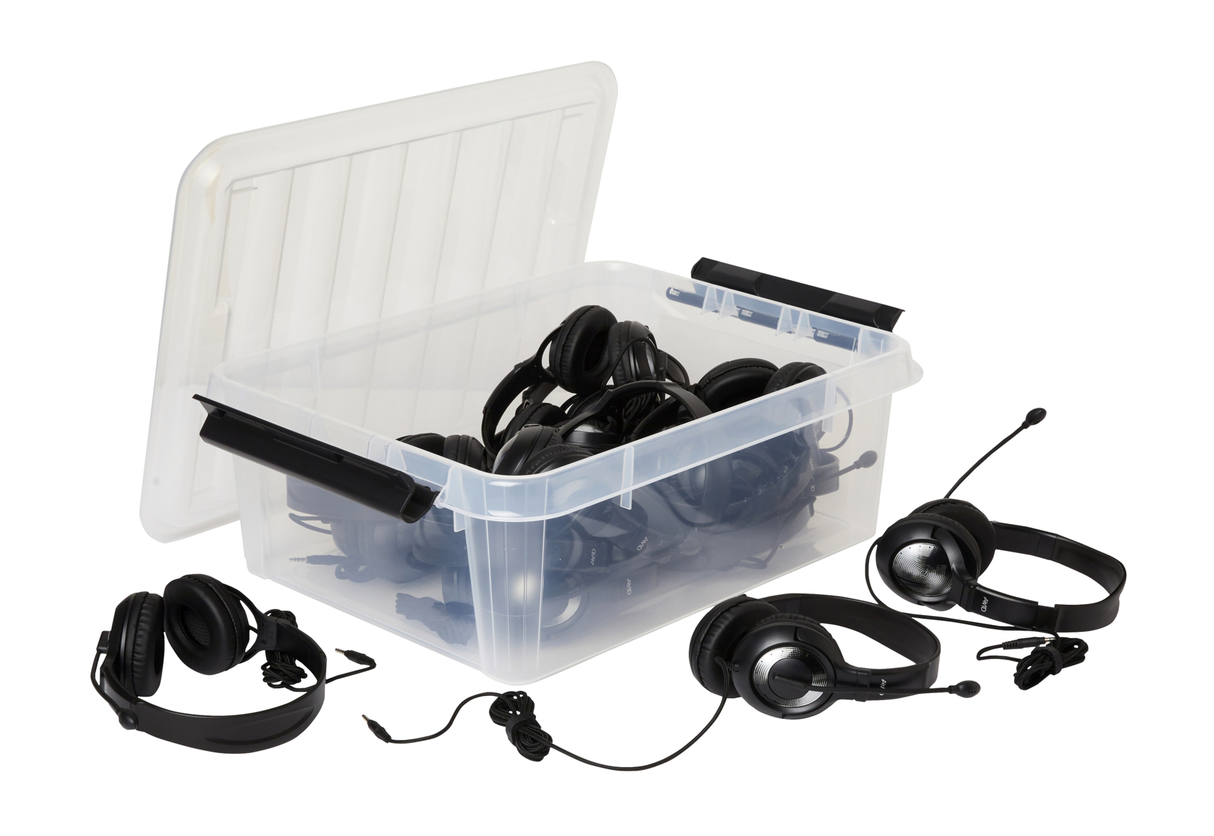 En stor sats som innehåller 15 hörlurar och 15 extra sladdar. Robusta hörlurar med bra ljudkvalitet speciellt utformade för skolor. Öronkuddarna täcker hela örat så att yttre buller minimeras. Sladdlängd 1,2 m. Levereras i en praktisk förvaringslåda. Lagom för åldrarna 5-12 år. Färg: Grå