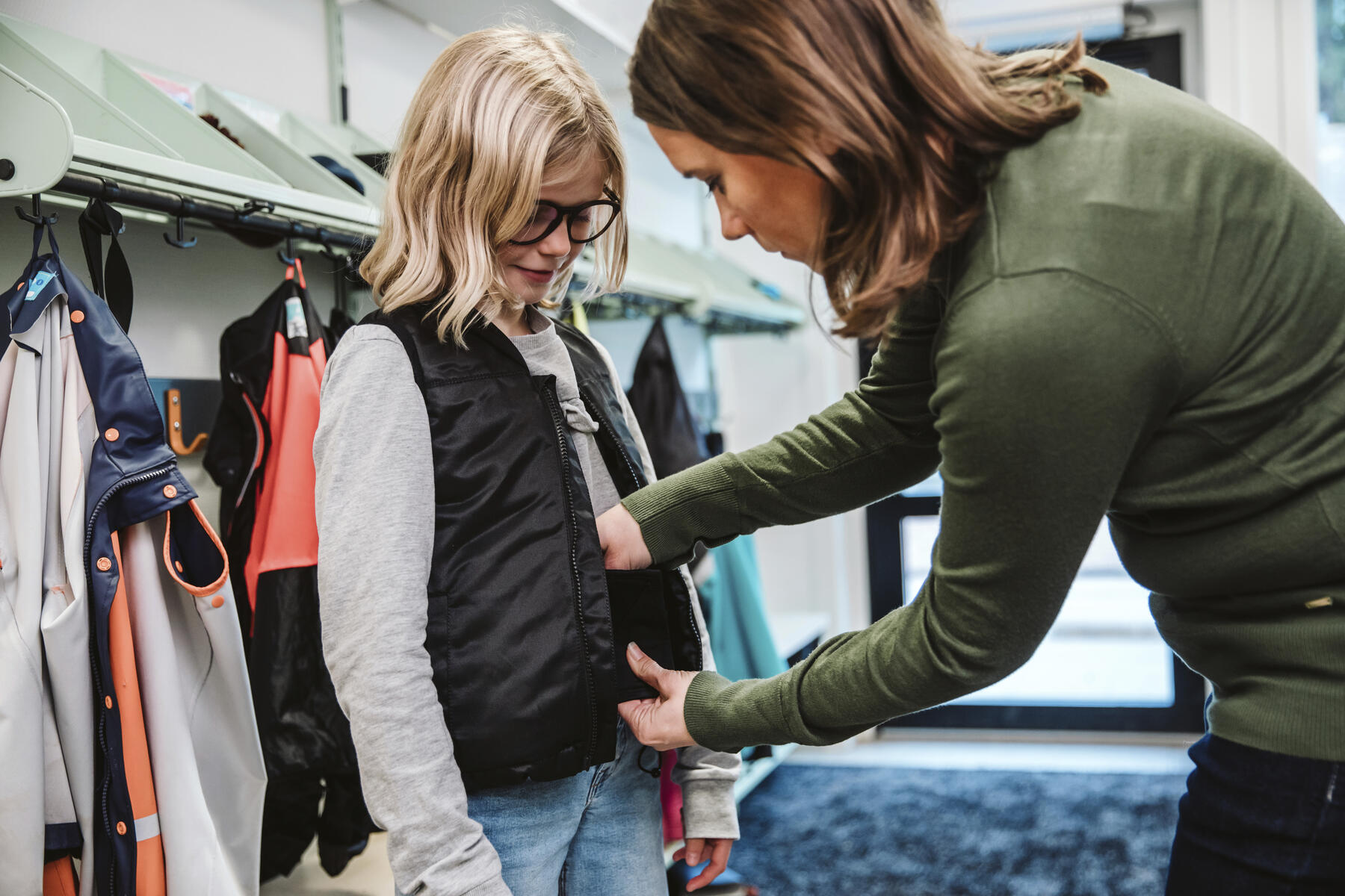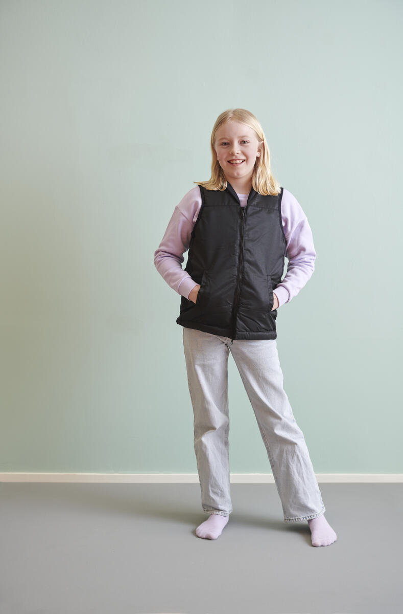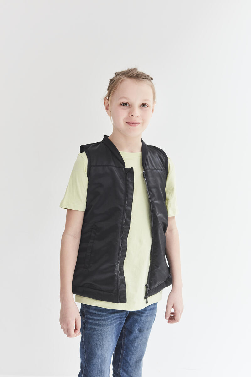 En mjuk och bekväm väst som främjar kroppsmedvetenhet utan att förhindra användaren att röra sig fritt. Med ett behagligt och stadigt tryck kan detta ha en lugnande inverkan på rörliga barn. Vikterna sätts in i dolda kanaler på framsidan och/eller baksidan av västen. Kardborreknäppning i sidorna. Mått runt midjan: 76 cm, justerbar längd: 38-51 cm. Vikt 1,4 kg.