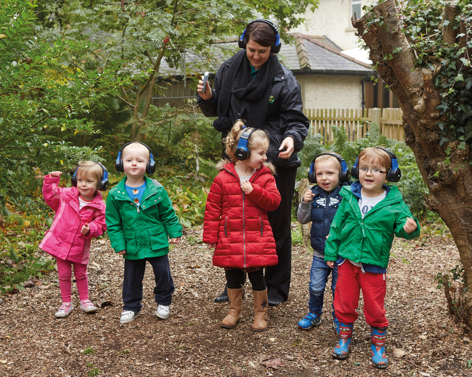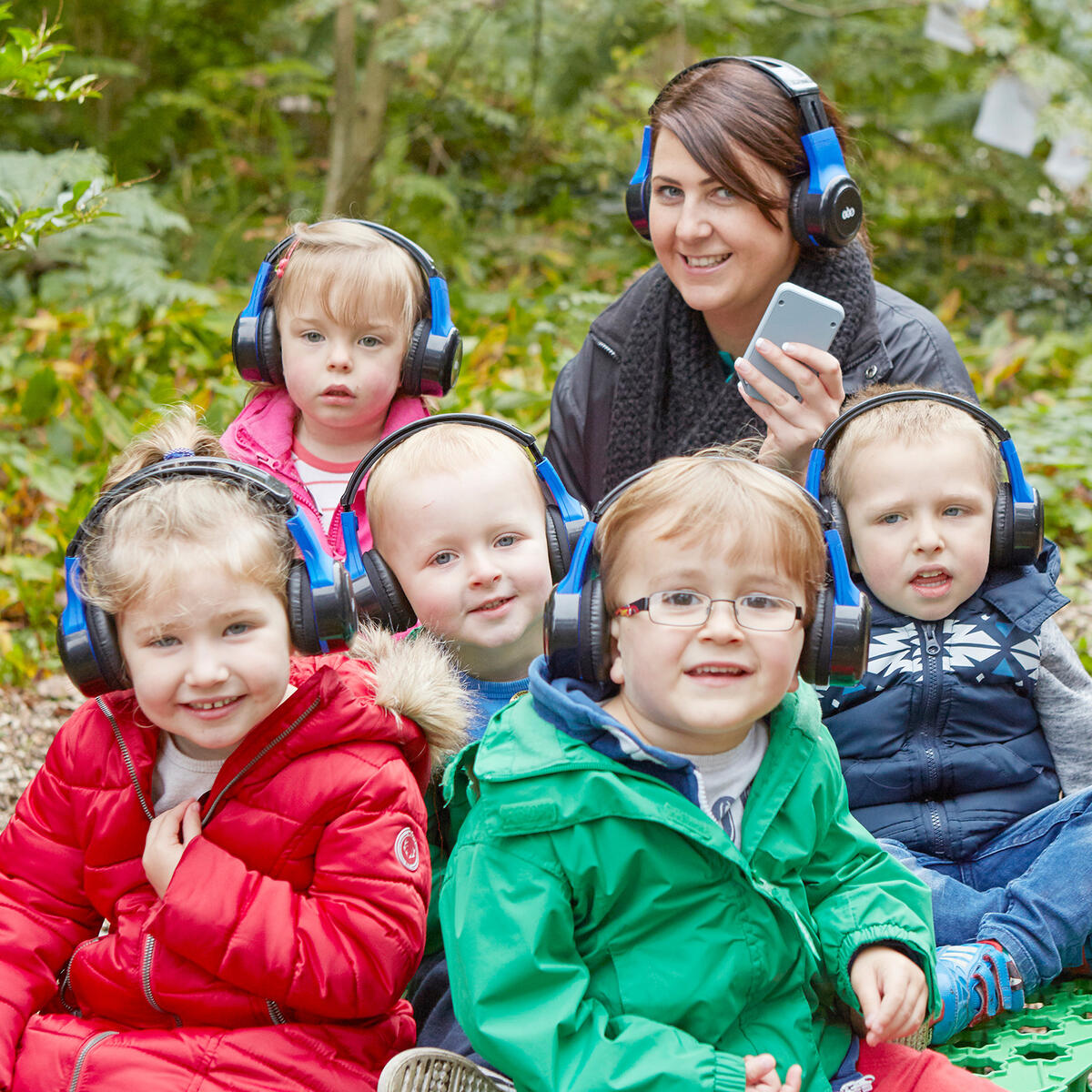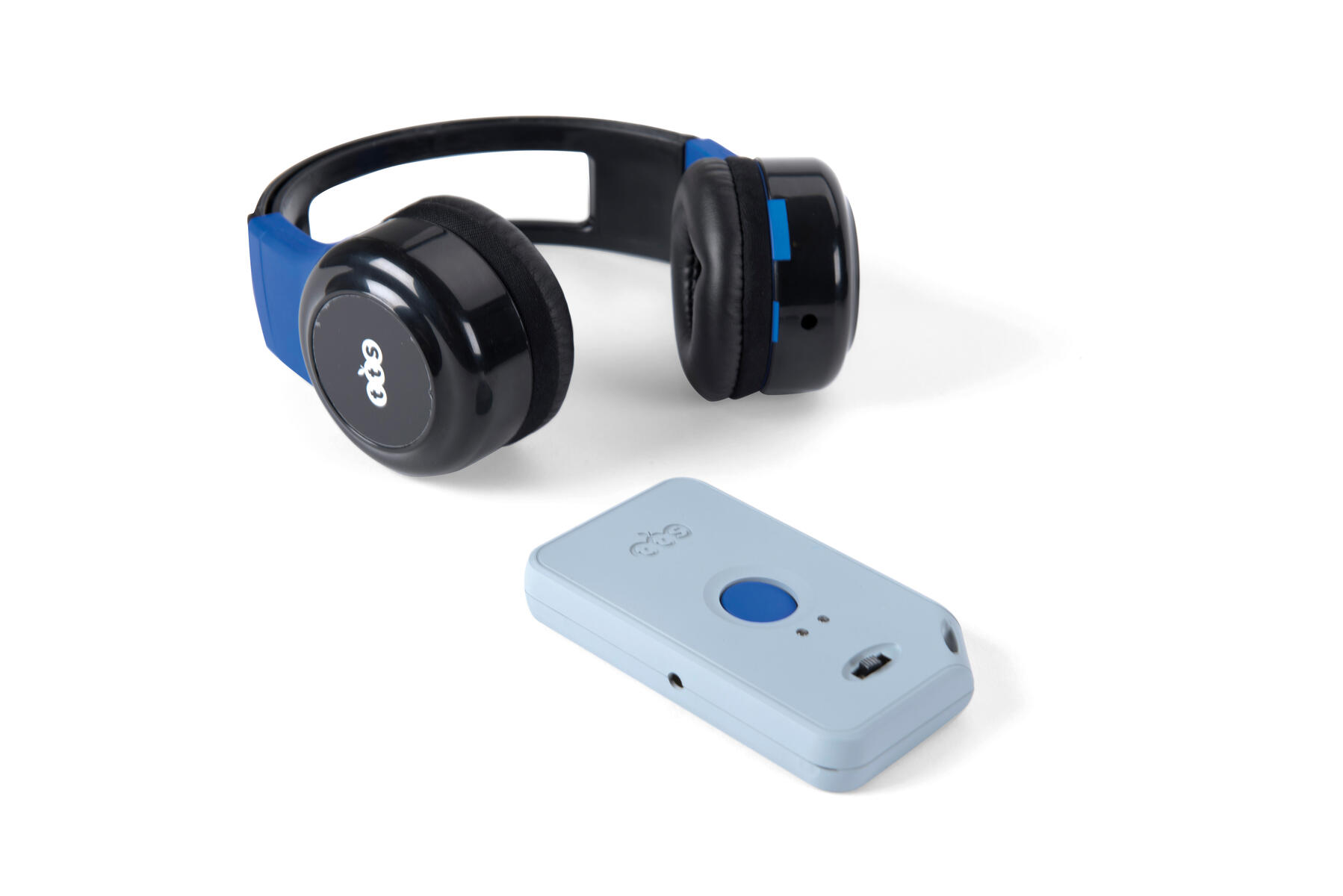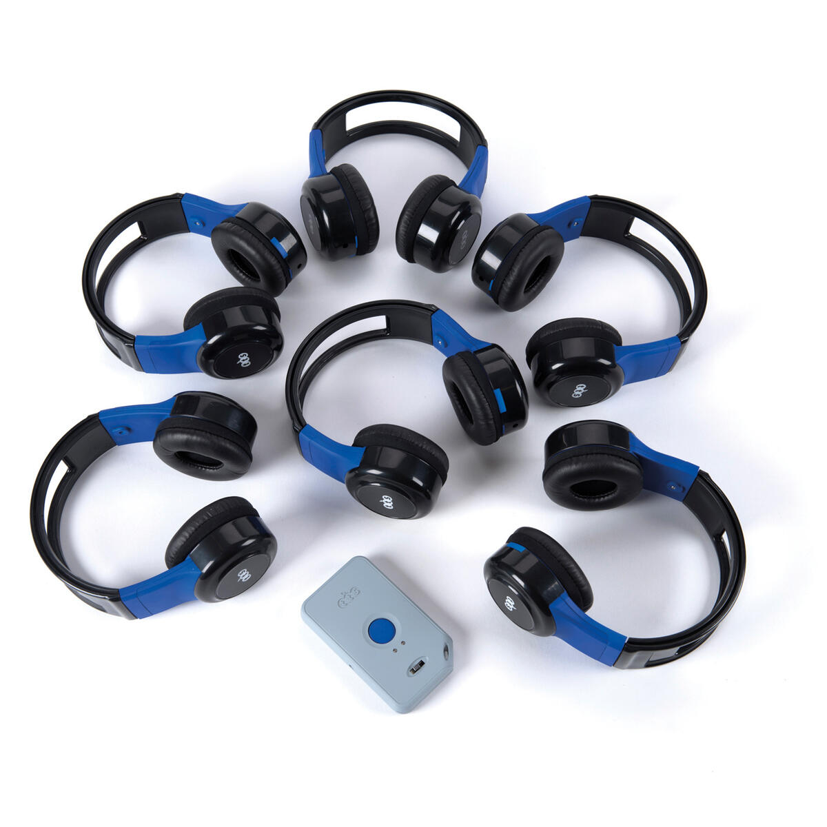 Nu kan du via en handkontroll trådlöst prata med barnen, spela musik eller berätta en saga när ni är ute i skogen eller inne i klassrummet. I varje lur finns uppladdningsbara batterier för upp till 6 h användning. Handkontrollen kan trådlöst vara i kontakt med upp till 18 hörlurar på 20 m avstånd. Du kan också ansluta dator, lärplatta eller telefon till enheten. Innehåller 6 uppladdningsbara lurar med individuell reglering av ljudnivå, 6 laddkablar för lurarna, handkontroll, laddkabel för handkontrollen, "splitter cable" med 7 ingångar för gemensam eller separat laddning, adapter och ljudkabel (används för att spela upp ljud från smartphone, bandspelare etc.). Rekomenderas från 3 år.