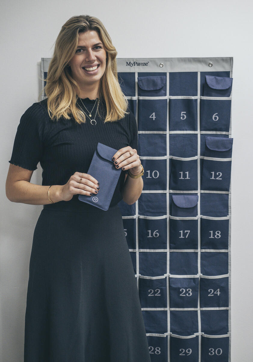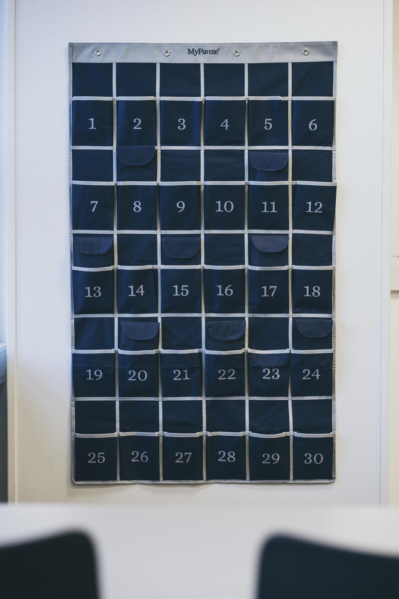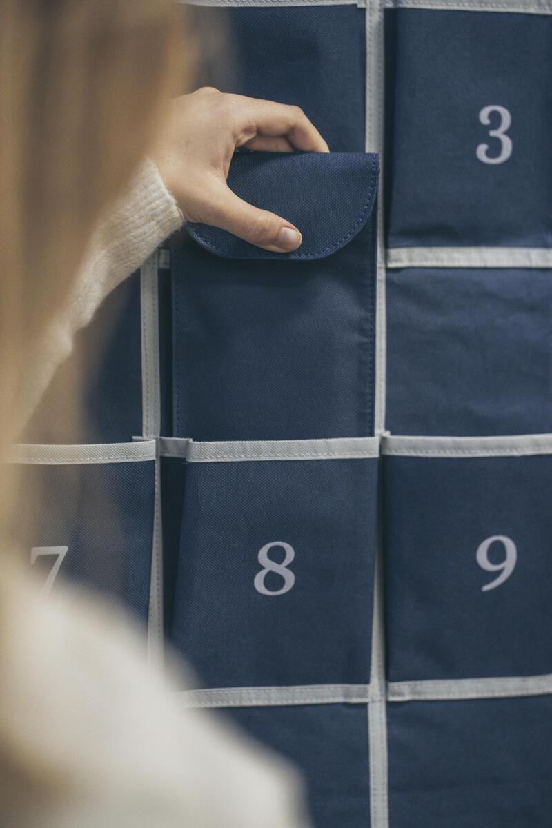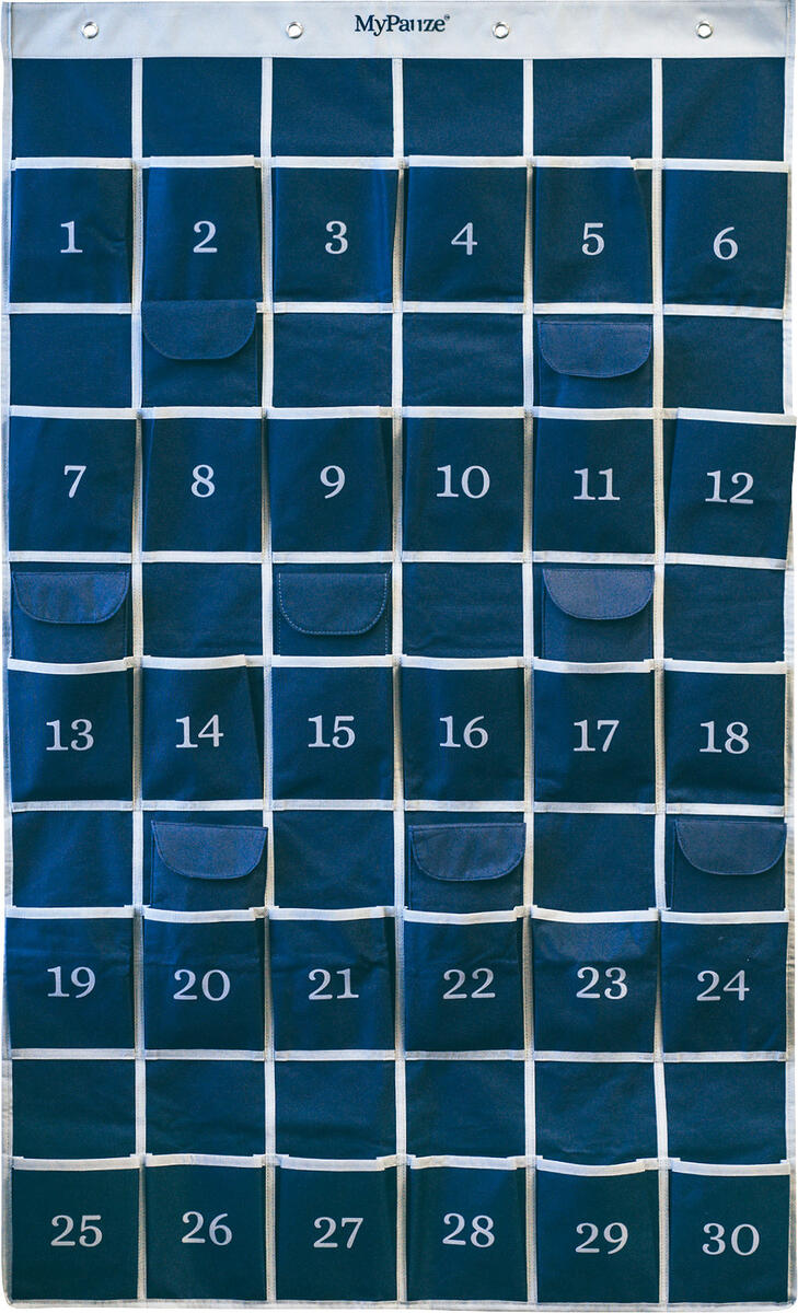 Vägghängd mobilförvaring med 30 fack anpassade för MyPauze mobilfodral. Facken är numrerade 1–30. Förvaringskalendern har 4 st metallringar för smidig upphängning. Slitstarkt Oxfordtyg i mörkblå färg. Mått: 130x80x0,2 cm. OBS, mobilfodralen köpes separat.