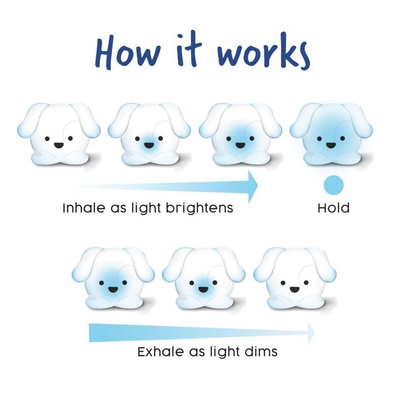 Hundvalp som lungnar med hjälp av andningsövningar. Med den blir barnen medvetna om sina tankar och känslor. Tre olika andingsmönster: andas i kvadrat, 4x4 andning och stegrande andning. Ger ett mjukt ljus i 5 olika färger. Laddas med den medföljande USB-kabeln. Material: Av HIPS och PVC, utan förbjudna ftalater. Mått: 13x10x10 cm. Från 3 år.